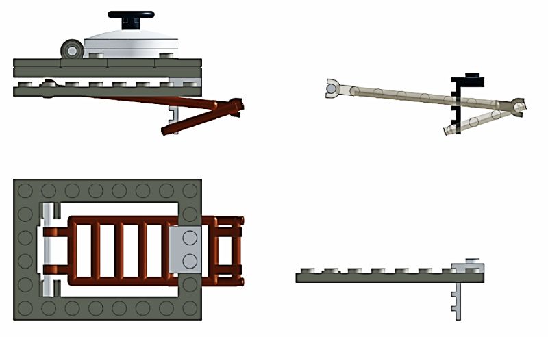 When calculating the size of the lower railing, the base length of the triangle was fixed at 10 studs, offset within an 11 stud footprint. Various heights were tested until the most reasonable hypotenuse was settled upon. The optimal height was found to be 12.5 studs, with a railing length of 16.006 studs. A 15-stud long rail with 2 end hinges (since each hinge connection is ½ of a stud out from the edge, they create the 16 stud length) seemed to fit within the tolerances afforded. The railings were then embellished with 1x1 brackets and round tiles.
