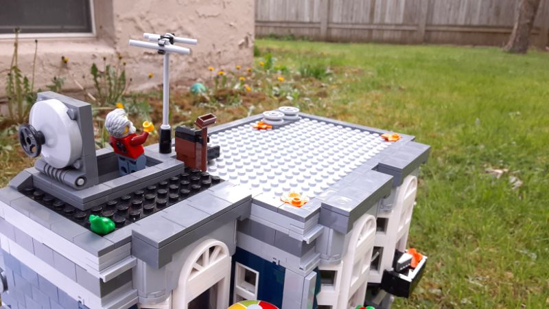 A series of square windows line the upper half of the ground floor, placed to give the impression of a converted industrial building. The second floor is designed to look as though it was preserved historically, while the ground floor looks freshly renovated. The aforementioned “brick tiling” enhances this distinction. Such details serve to give the building a history and help to tell a story. This is something I learned from the wonderful visual storytelling in set 10246, Detective’s Office.