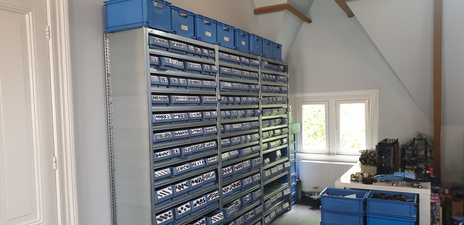 The actual container size they go into then varies. The final criterion is then a somewhat personal and abstract concept of 'usefulness'. This in practice means that common bricks and plates are in the middle of the shelves, whereas large and/or specialised parts are at the top and bottom. At some point I realised that I would (probably) never MOC anything with more than the largest container full of 2xn bricks, so I now cap the amount of space any single part-set takes. There's also two crates full of just Technic pins/axles/bushings somewhere...