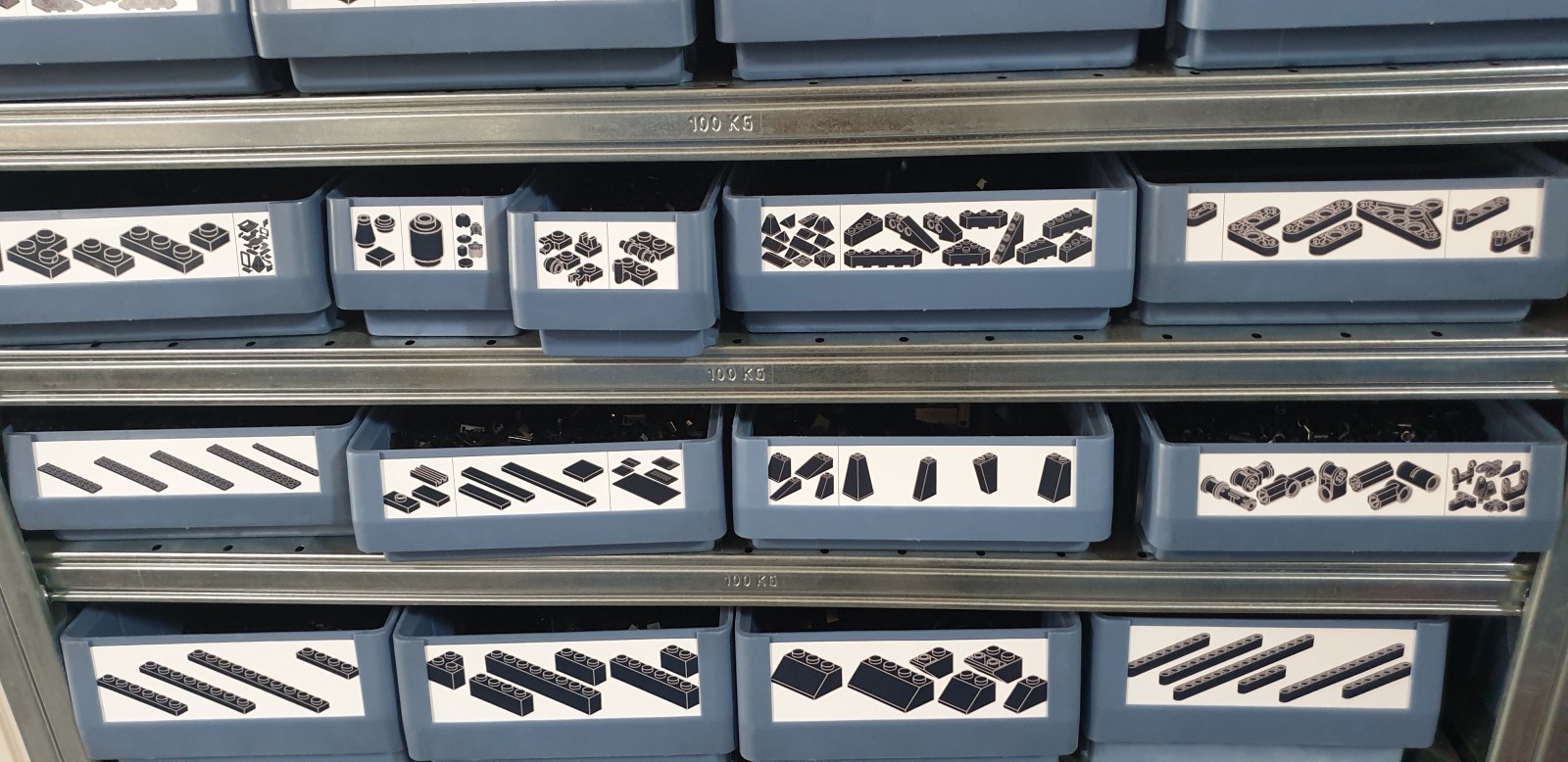 I tried to minimise the whitespace between the parts (thus overlapping the bounding rectangles), but that became very hard to do. In the industry, this is known as a 'packing' problem, and it is a very hard problem to solve. That's why, more than 10 years ago, I started developing a piece of software that produces labels for the containers. It optimises (reduces) the amount of white-space between the images, so the parts can be as large as possible on the label. I spent a lot of time tuning and perfecting the algorithm so it could run in a reasonable amount of time. (Large amounts of parts still take hours). A few years back I switched to rendering my own (higher-resolution) part images based on the L-Draw part library. I print the labels on photo-paper and cut them out by hand.