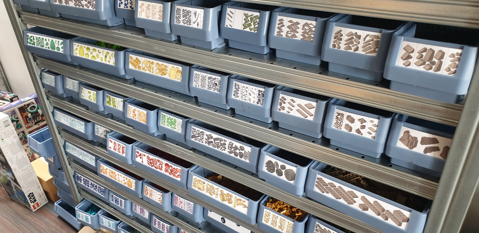 For large things, excess parts and temporary storage I use Curver crates, which they unfortunately don't produce in consistent colours as the years go by. I mainly build on two 1x2m Ikea tables, and my desk.