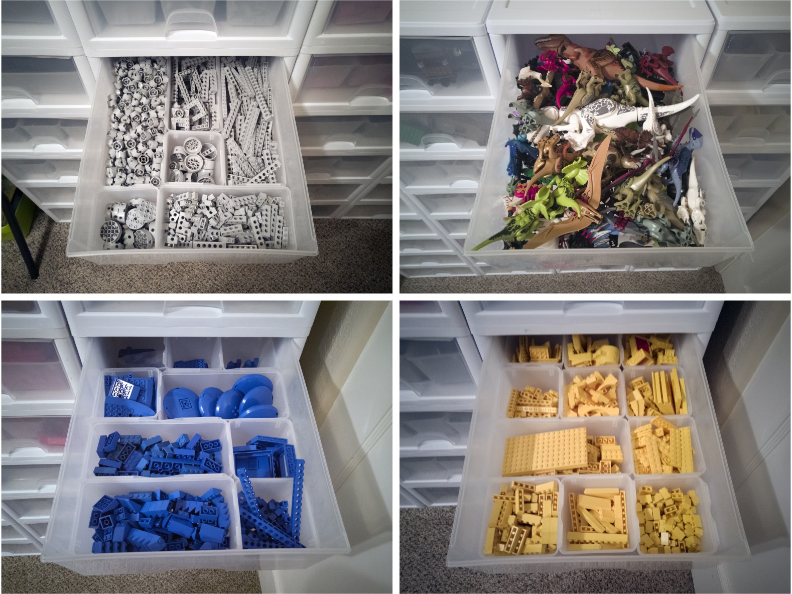 The Dollar Tree drawer organizers fit perfectly inside the 16qt Sterilite stacking drawers. I use these drawers for overflow and other bricks and pieces that are too large to keep in the Stack-On and Workzone drawer organizers.