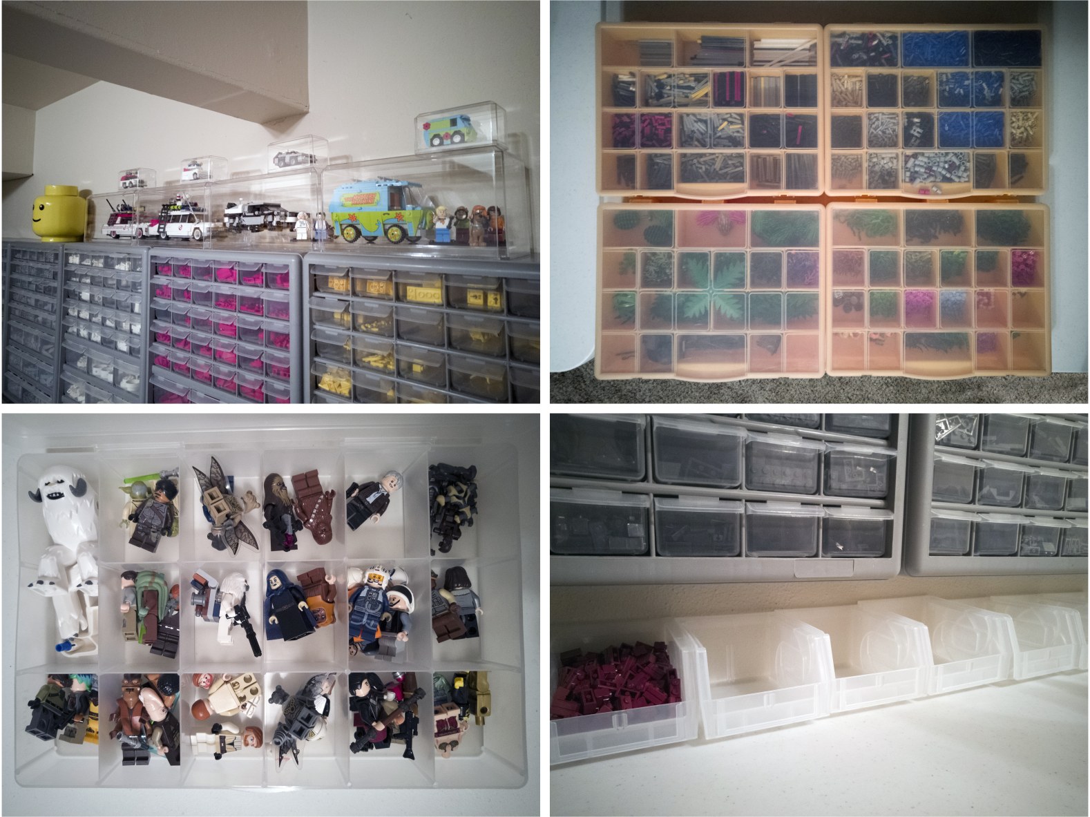 The Majority of my bricks are sorted by part and color in Stack-On drawer organizers (which are no longer produced in this style, hard to find, and very expensive), Workzone drawer organizers (from Aldi, very affordable, but usually only available during early spring time), and Sterilite 16qt. stacking drawers with plastic drawer organizers from the Dollar Tree (good luck finding any in Oklahoma City, I cleaned them all out).
