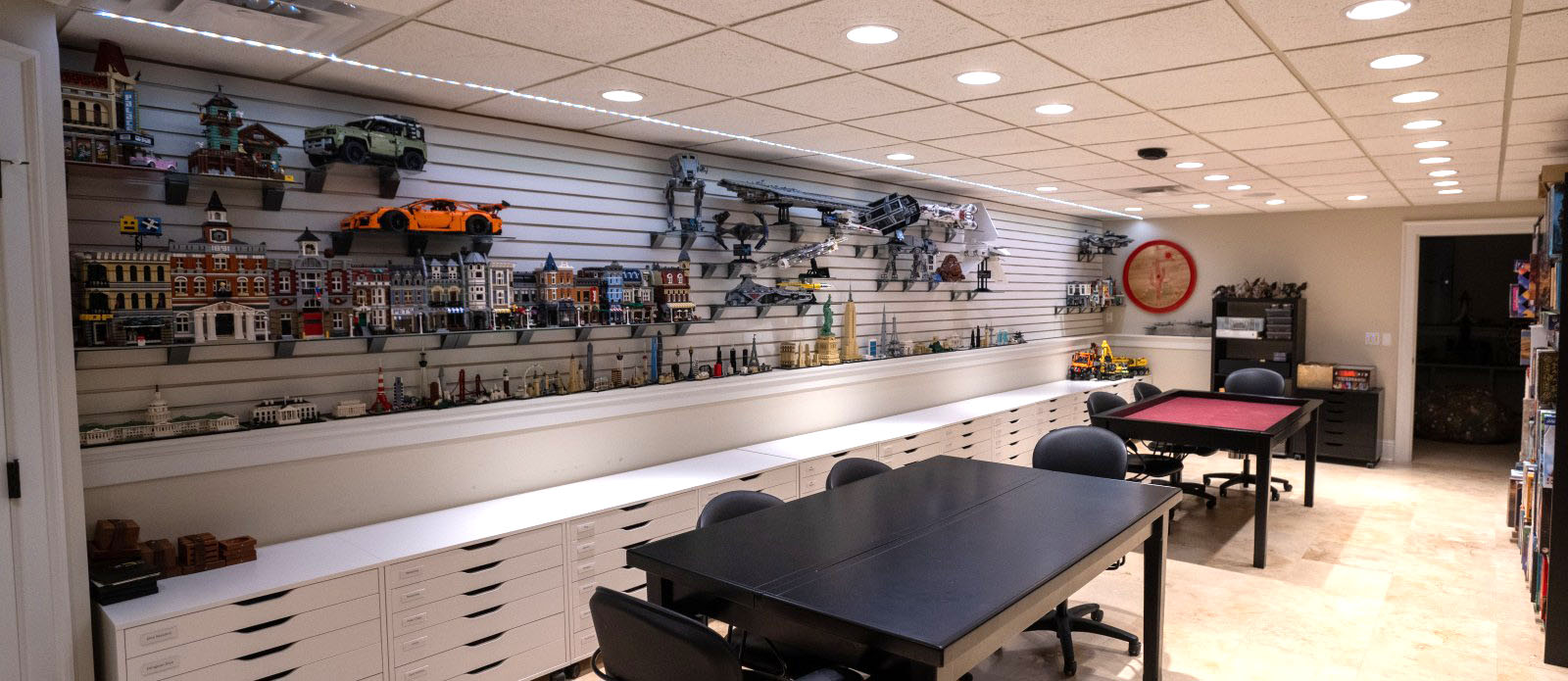 At some point I started running out of display space in my LEGO room, so fortunately I had a game room right next door with a giant wall of unused space. So I tried something that I haven’t seen done for LEGO before, and installed some commercial slatwall. This is the stuff that you see in many retail stores, and they make lots of peghooks, shelves, and other attachments for it.