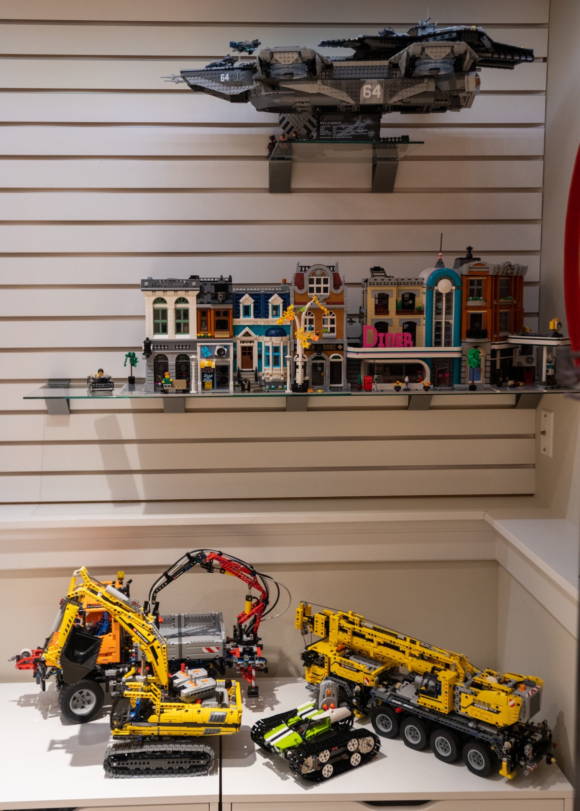 Finally, I have many of the sets I have built displayed on IKEA Besta shelves which come in a few sizes and can be mounted on the wall if desired. I like these because they are deep enough to fit big sets, and they have optional glass shelves. I put the display pieces up high and the play pieces down below for the kids to enjoy.