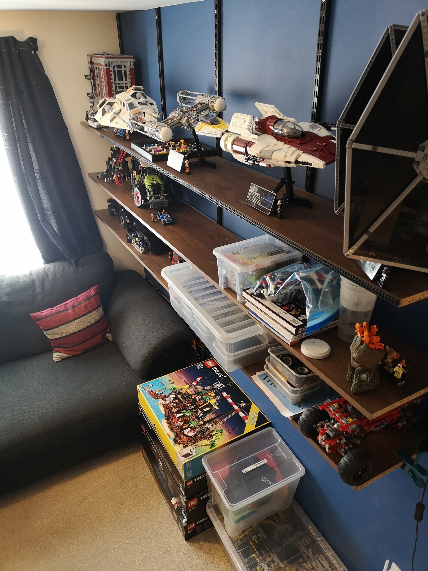 I have one small room for Lego, which is a spare room at a pinch so needs to be relatively clear. I've put shelves up which double up for display and storage - they're nothing special, just twin-slot brackets and supports and some shelving I cut to fit.
