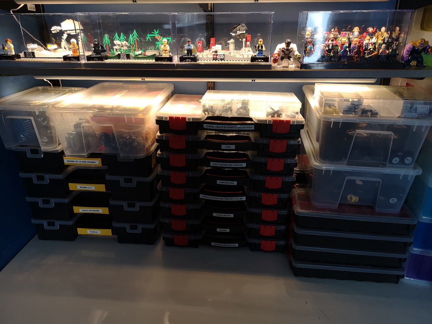 I have organised my Technic pieces into some broad categories and used a combination of Stanley Sortmaster, generic compartment storage (from Screwfix and B&Q) and bulk plastic boxes. The Really Useful storage tower I originally thought would be used for pieces is mostly full of instructions.