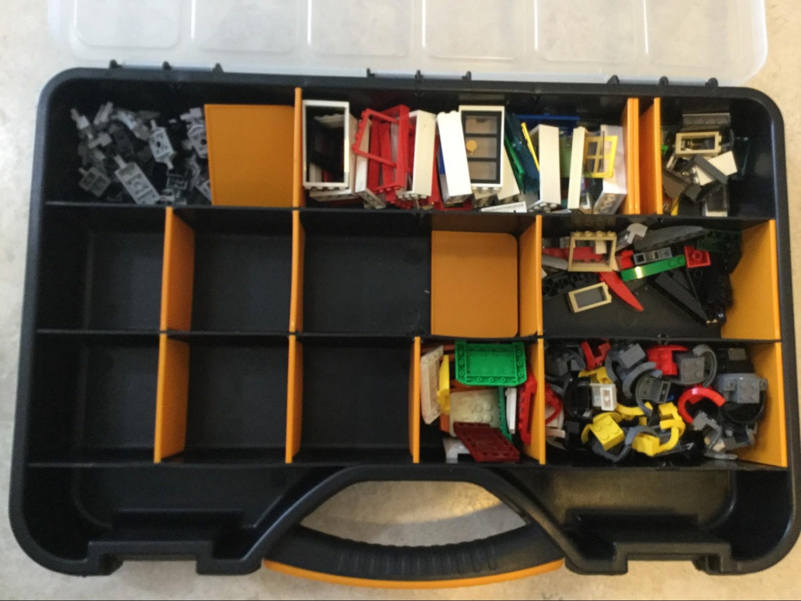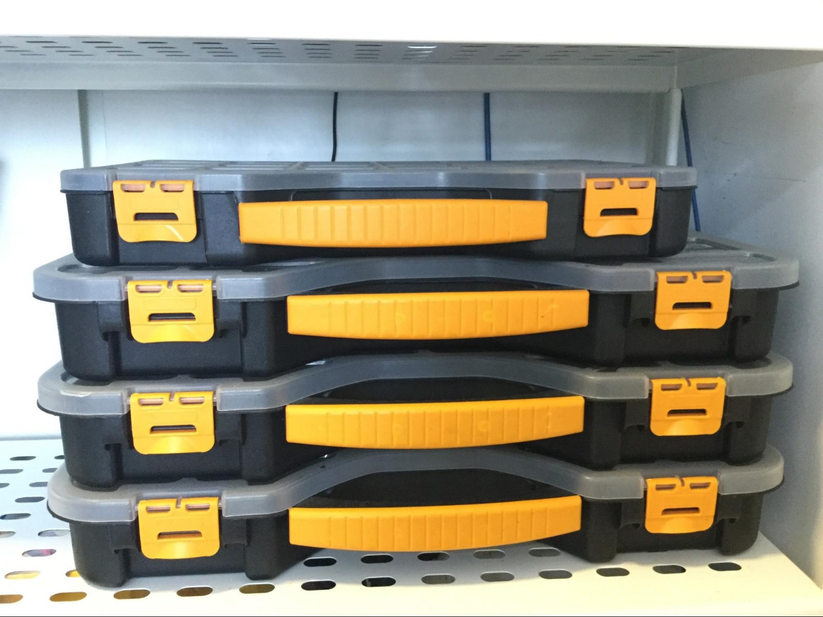 At first, I used these MANO craft/toolboxes. They are relatively easy to store and come in a few sizes. I find these toolboxes somewhat hard to access when building, because there are multiple steps involved when trying to get a part out.