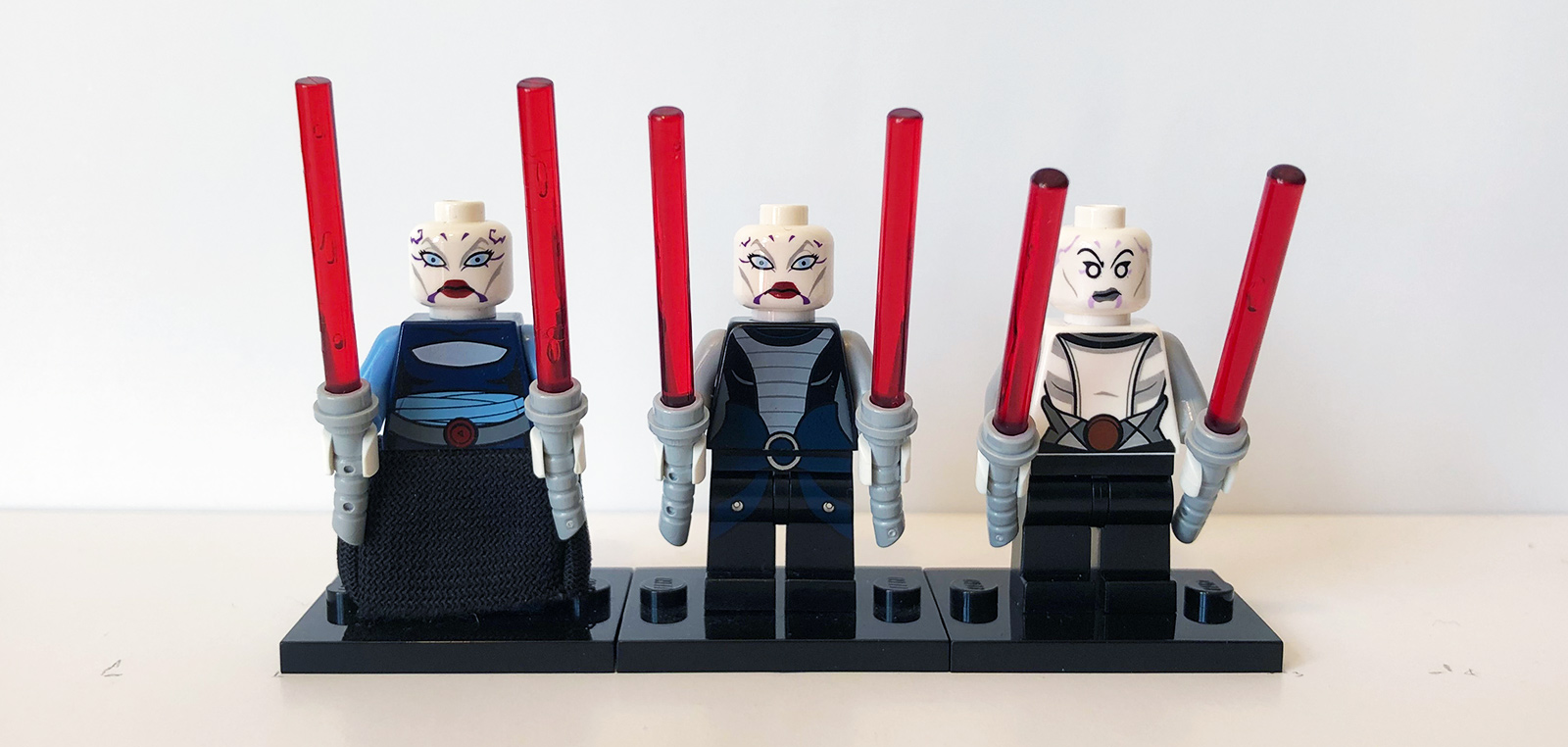 Asajj’s identifiable features are discrete but the minifigure has always used a white head showing her facial tattoos. A later version based on the original ‘Clone Wars’ in 2015 toned down the facial print to more closely match the source material (see above).