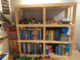 I started storing all the boxes inside each other and that worked for a while, as the train boxes are huge and can “eat” several other smaller boxes. But soon an entire closet became filled to the max with sets. So, using some skills my dad had shown me growing up (he did wood-working as a hobby), I decided to build a solution. This was not my first choice, as I had explored getting pre-built racks and storage at various stores. But none of them really fit what I needed nor actually fit where I needed, plus the price of them where downright outrageous at times!