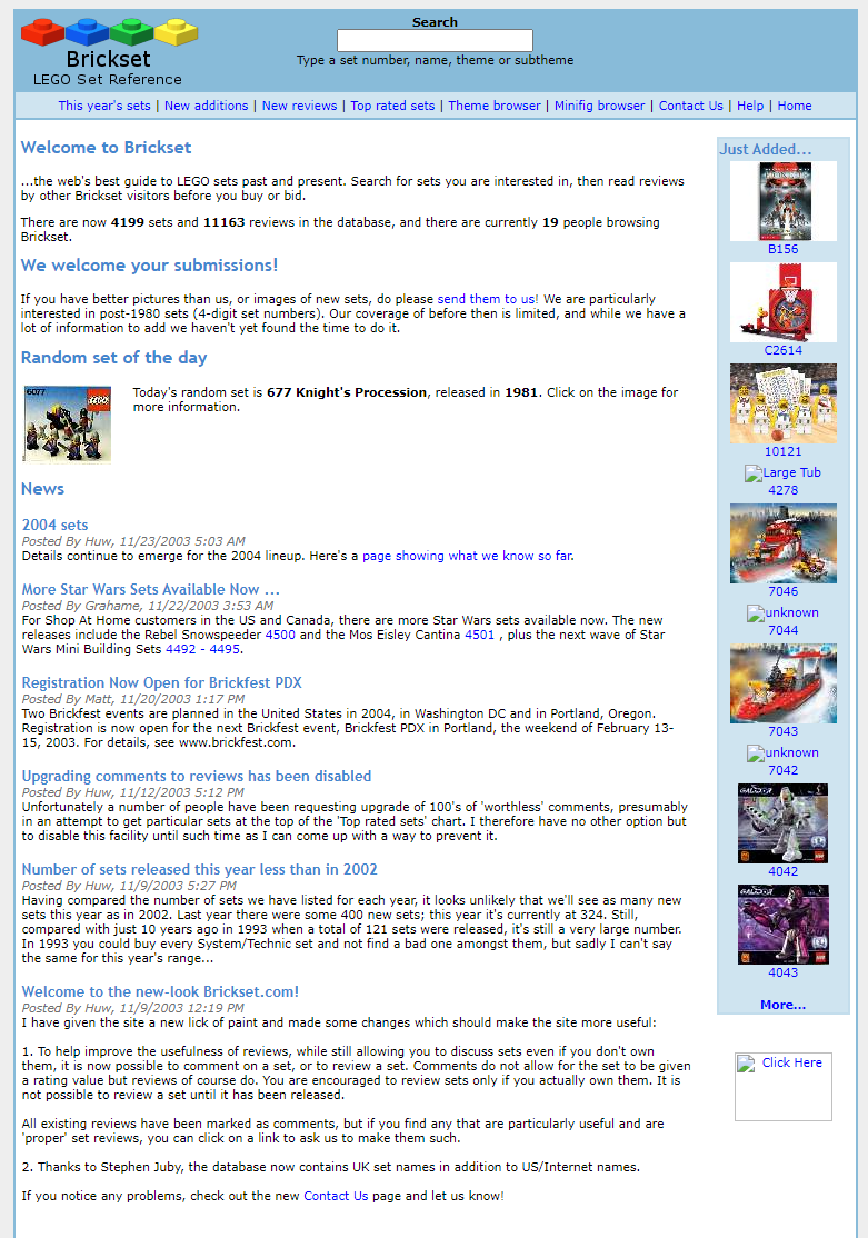 Even back then it was one of the most well curated sites in terms of sets. It's actually remarkable how many sites have been and gone over the years. I really appriciate @Huw your efforts to continue this page, and not see it disappear entirely like Brickshelf, or fall into unmaintained/abandonware status like Peeron and many others.