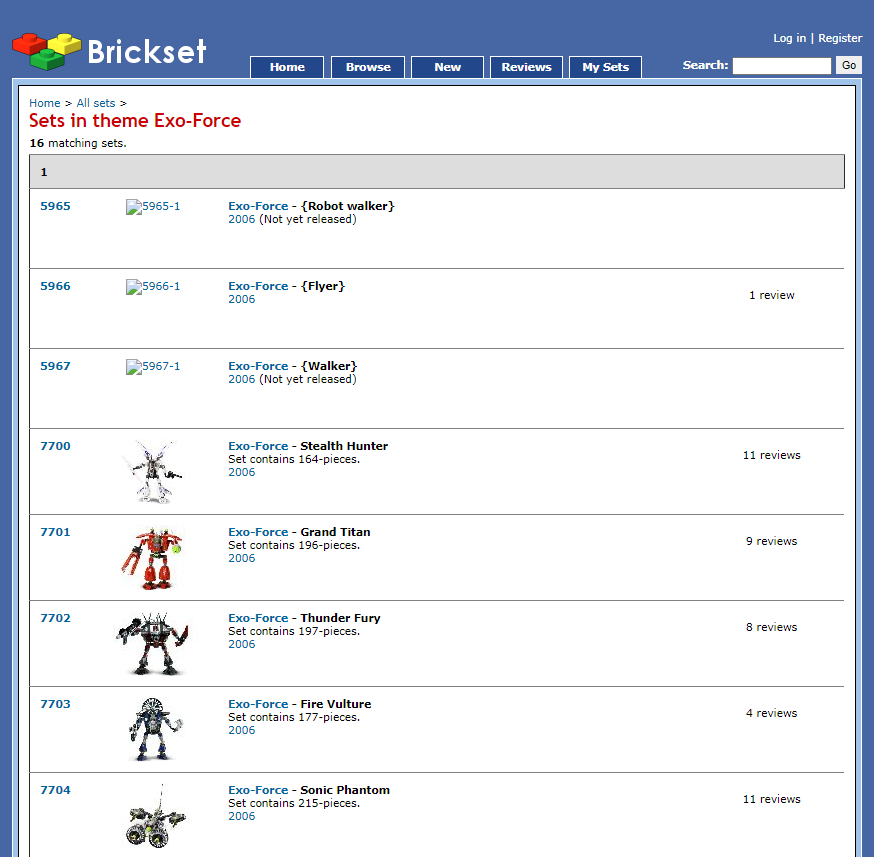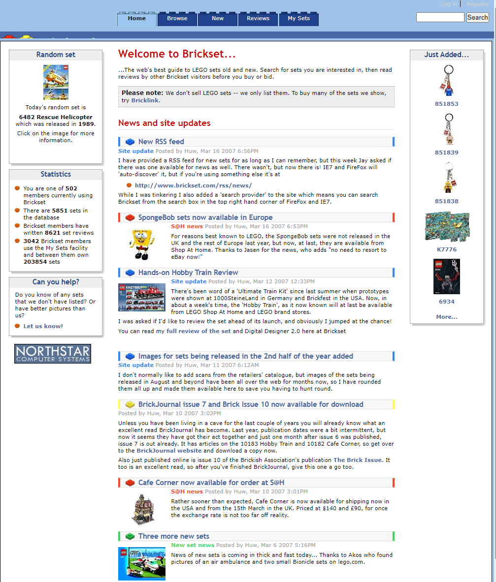 Yes, the 2005 screenshot takes me back. There must have been some hiccups in June 2005 with Brickset 3.0 that must've been what ate several of the set reviews I posted in that timeframe. I sent an email to Huw on June 11th, 2005, noting how reviews I wrote under my old username for sets like 6277 and 8563 had seemingly disappeared. Never got an answer for that, but considering I only just remembered this by looking through my ancient emails, it must not have fussed me too much! In all honestly, I could probably write better reviews than what I wrote back then!