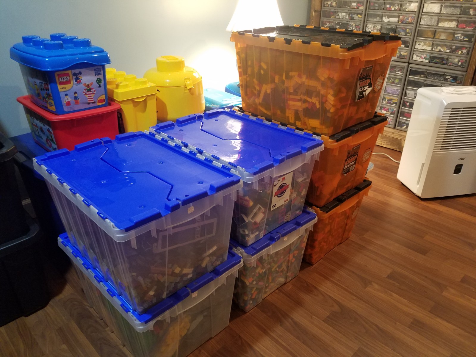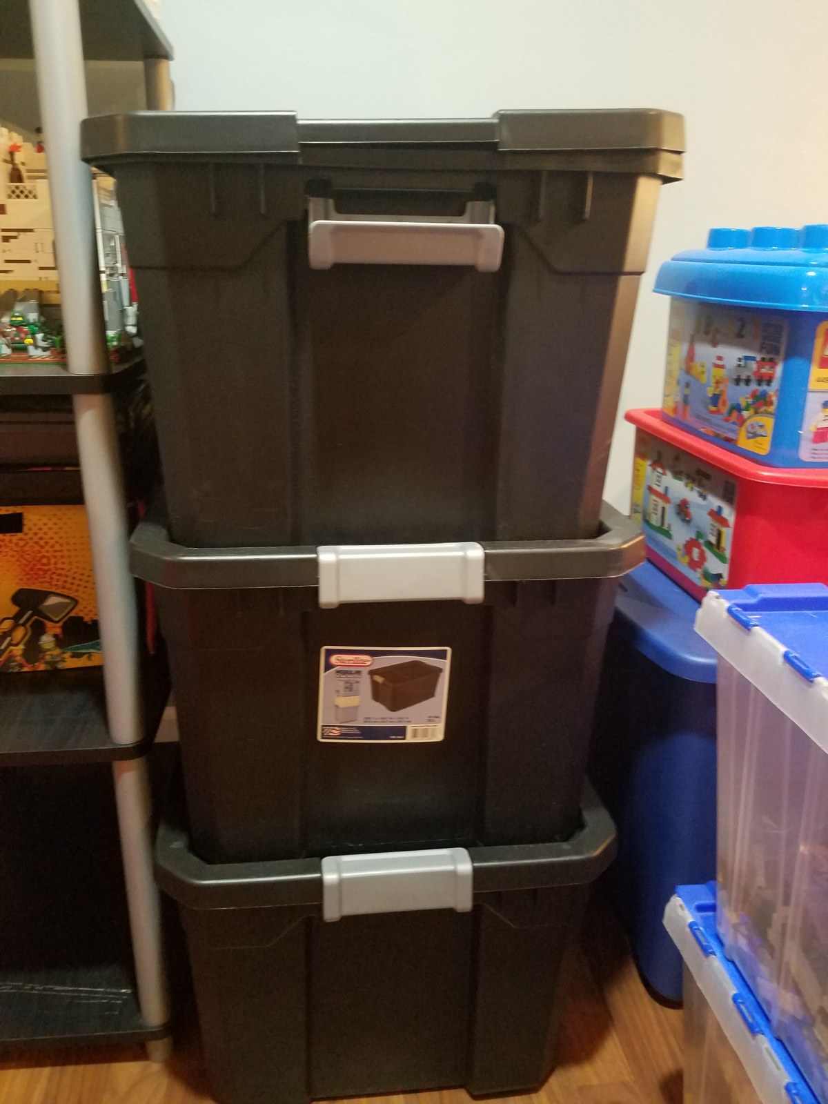 Though it isn’t the most visually appealing to have them in the middle of the room, it saves me time when building. These storage containers were given to me by my parents from our childhood home which gives them some age. Because around me they are only available online, I’ve ended buying a different kind of container to store other larger pieces.