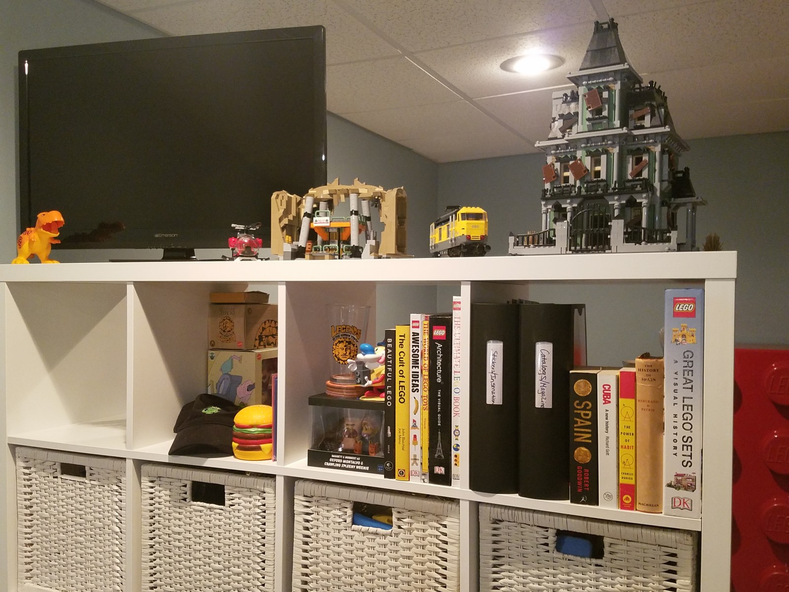 The IKEA KALLAX separates my LEGO room from a space that is used as a home office. I use this shelving unit/bookcase to house many different items. Of notable interest here, several of the baskets house LEGO branded clothing or official LEGO store aprons/polos that were acquired over the years. Two of the baskets also contain LEGO related books.