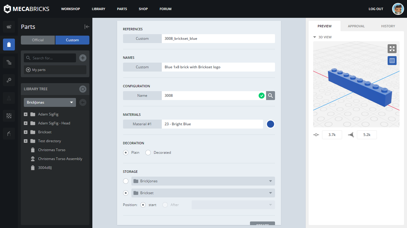 Nice, it found the right brick for us. A 3D preview appeared on the right side, and a couple of new sections showed up in the form too. You can pick the material for your brick (you can use all type of materials here, even metallic, transparent, glitter, etc.). For this brick, I'll pick a Bright Blue solid material.