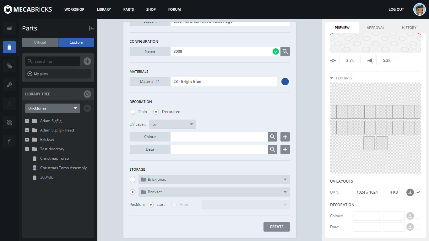Congratulations! You just made your first custom decorated piece on Mecabricks! You can now go to the Workshop, and select your own directory in the brick palette (it'll be at the end of the list, as "Custom Parts"):