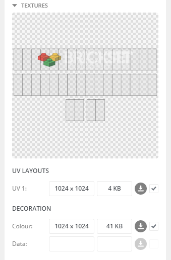 Now we just need to hide the UV map and export, then upload this image to Mecabricks Part Manager, but this time to the "Data" field in the Decoration section. It'll of course show up in the preview window too: