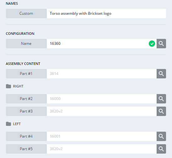 As you can see, there are some placeholders in these text fields, and you can actually use those suggested part numbers for everything but the torso itself. For that, you'll need to use the reference name which you gave for the custom torso, in my case, it's 3814_brickset. After you added all five parts, you'll notice that you can pick two different colours for the arms, and that's because they're dual moulded minifigure arms! I'll just pick a bright blue colour for the upper arms, and bright yellow for the lower part and for the hands. This is a fantastic feature on Mecabricks in my opinion, because you can easily use different colours for these pieces later (if you'd like to use reddish brown, medium flesh or light flesh for the lower arm and hands for example).