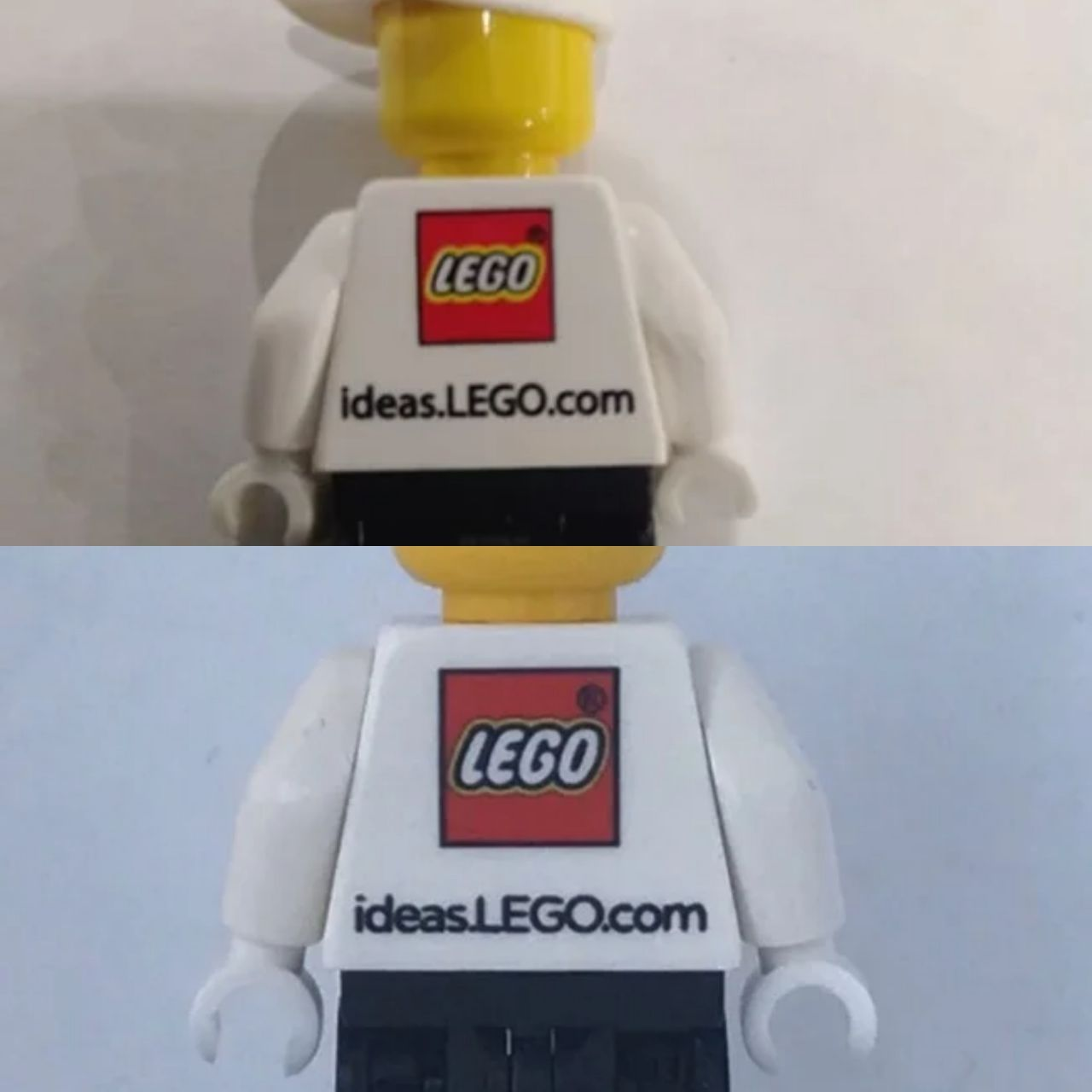 Now, the one Korean minifig has a typo, as one minifig says "BricKorea" and the other says "BrickKorea" with an additional "k". But even then it's hard to classify one as being a misprint without knowing more of its history. Was it a test run that was rejected? Is it a counterfeit? There's a set of LEGO Store employee minifigs with yellow aprons. One of those is a very rare zombie version that was given out in much lower numbers than the basic version, but even rarer than that is a printing error of the regular employee. The nametag ended up being printed on the wrong side of the apron because the person who made them didn't realize that there are special holes stitched into the apron that you can thread the pin back of the nametag through without damaging the cloth. So, the first batch of those was rejected and he had to print a new batch. Only a handful of that first batch made it into the wild, and that's something I would consider a true misprint.