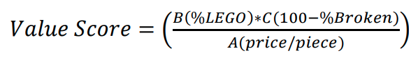 In these three steps I have accomplished the goal of analytical comparison and gained a method to apply a baseline to generate meaningful scores for my bulk LEGO purchases. A few more thoughts to wrap up the discussion: