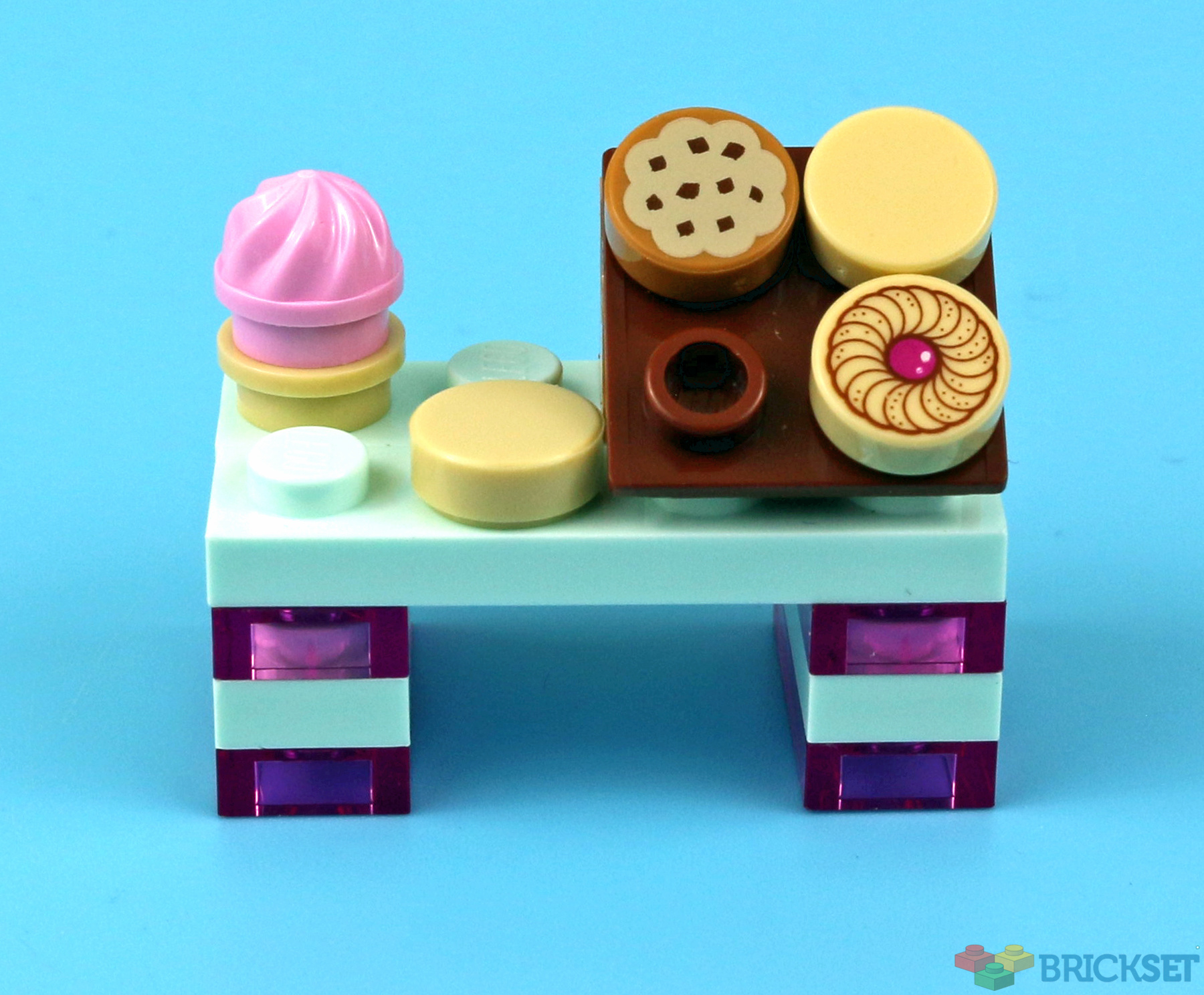 The build reminds me of the Elves colour scheme, which I rather like a lot. At 21 pieces (including spares), this ties with the hearth as the weightiest build yet. Alas, I'm not sure that we can count the transparent 1x2 pink plates as being purple, so our purple streak ends for now. But....there are four kinds of cookies!