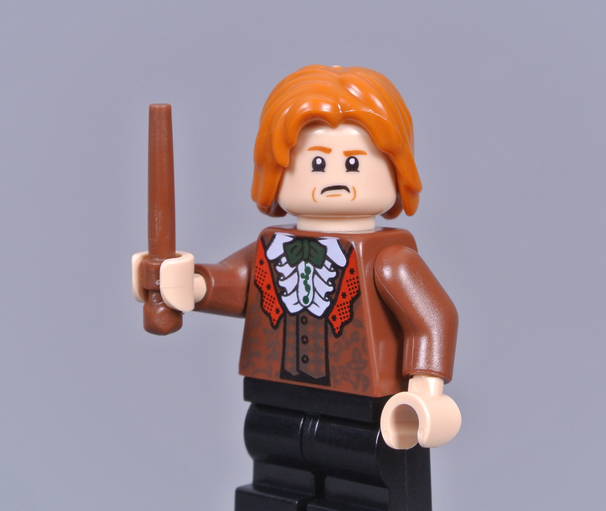 The reddish brown dress robes appear appropriately ornate, featuring subtle patterning across both sides of the torso. I like the red frills around the collar and the billowing ruffs on Ron's shirt closely resemble the source material. Unfortunately, the jacket decoration does not continue on the medium legs but I expect that would have been difficult to achieve since these medium legs have not been dual-moulded before.