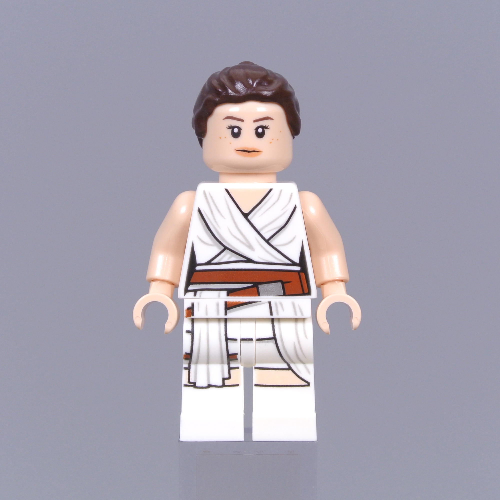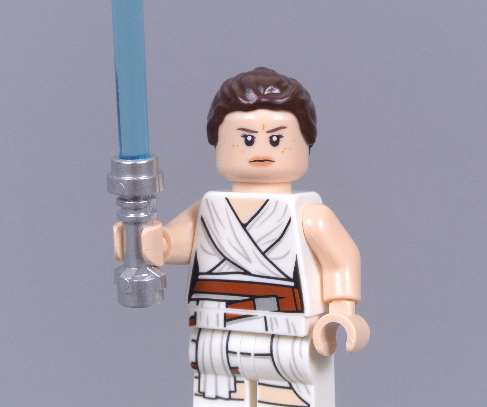 Freckles decorate both sides of the head alongside smiling and determined facial expressions. As usual, Rey wields a blue lightsaber with a chrome silver hilt, in readiness for battles against Kylo Ren and the First Order.