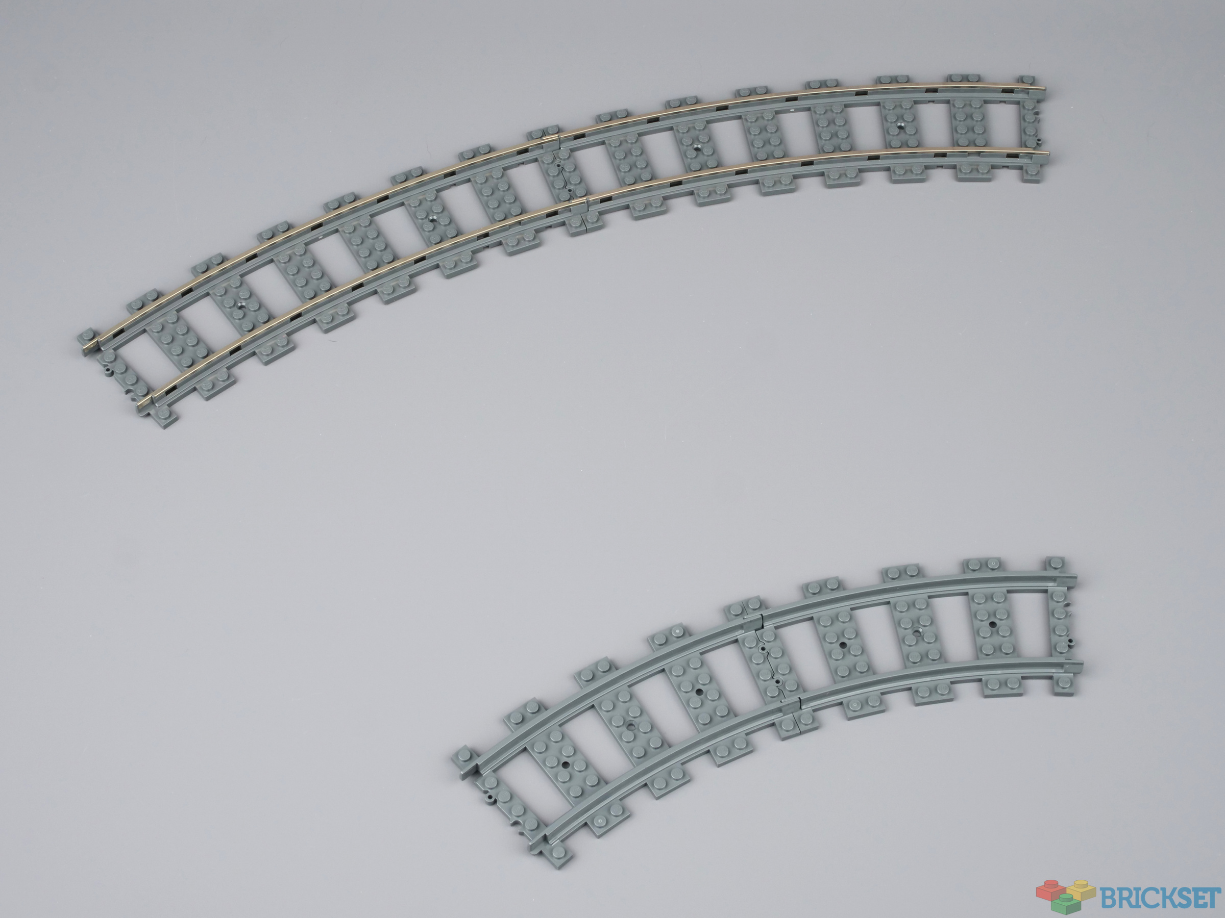 Track is sold in boxes of eight pieces and two types are being manufactured at the moment: 32-stud long straight rails and 72-stud radius curves. LEGO's own curved track has a 40-stud radius.
