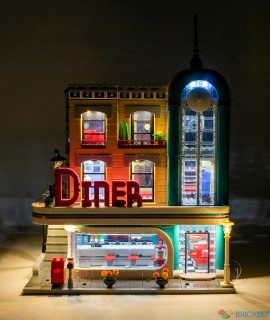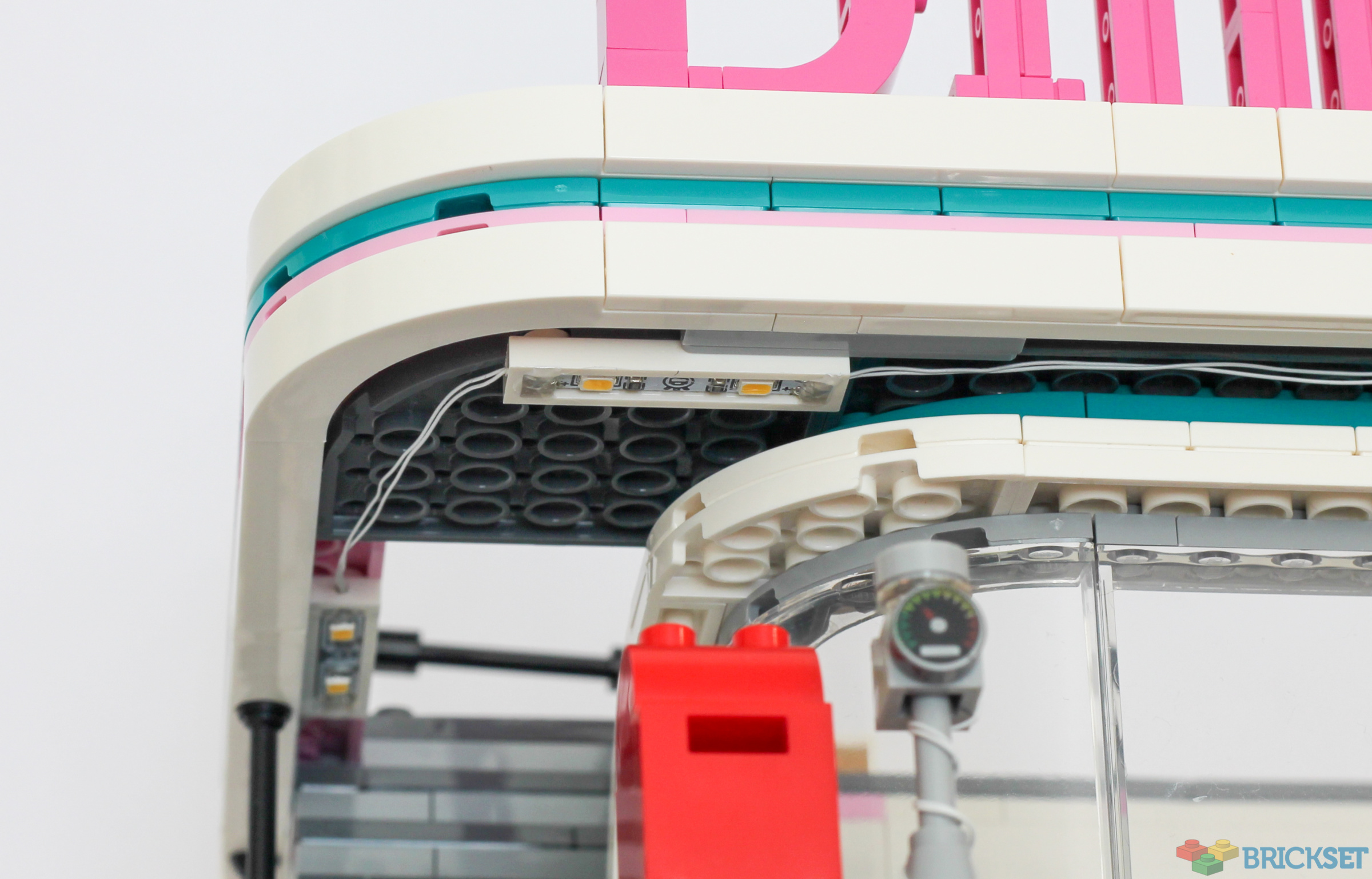That harsh lighting within the diner itself almost makes it look real. I would have thought that the whole of the turquoise arch was supposed to light up too, but that would be asking a bit much. It looks good, although I don't collect the modulars any more, nor do I have an interest in lighting any LEGO sets (none that I currently have anyway), but I'm sure there are plenty of fans who'd love this.