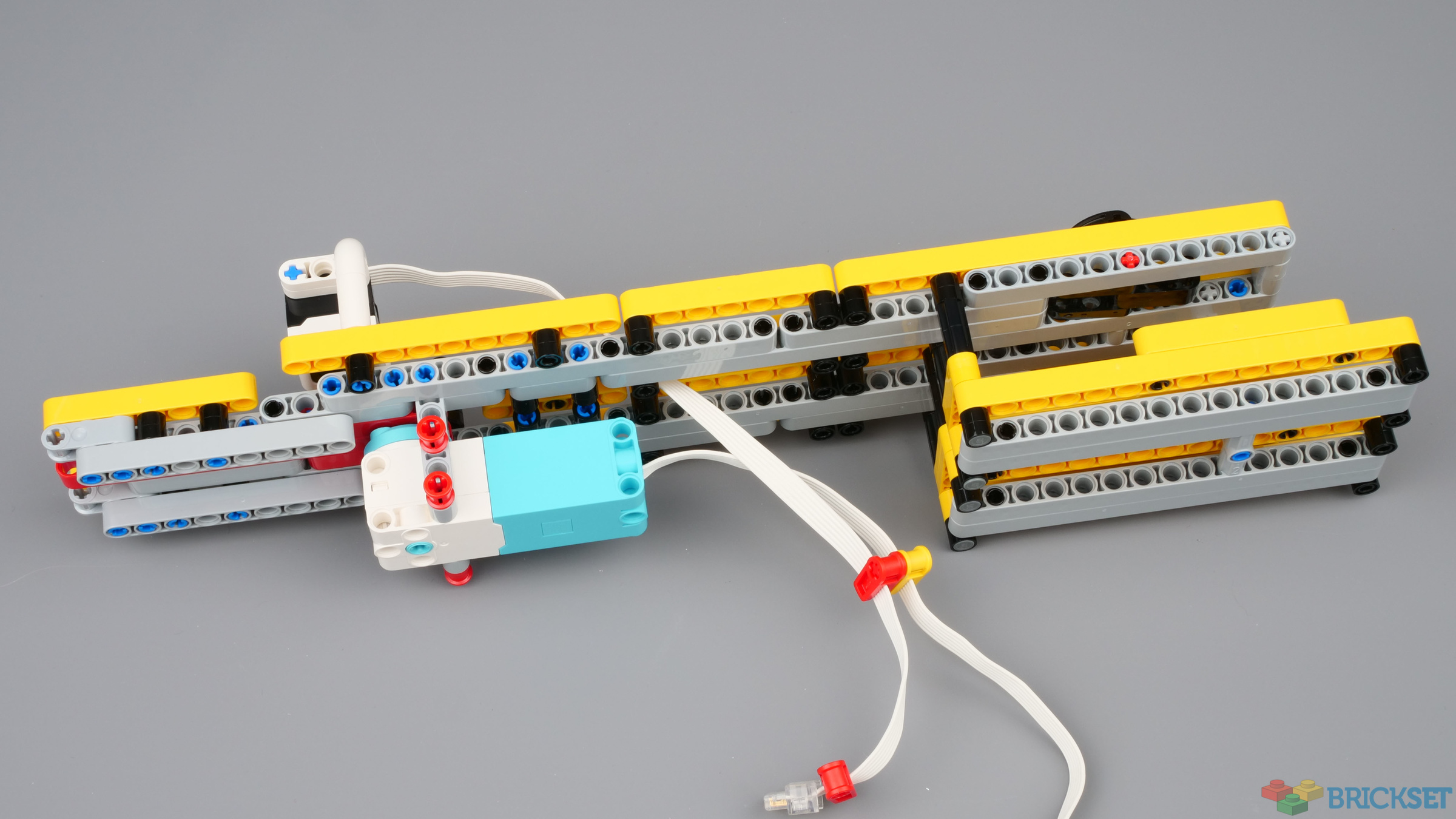 In addition to the large SPIKE Prime hub, it utilises three medium motors and one light sensor. One motor drives the belt, another sorts the balls, the third releases them.