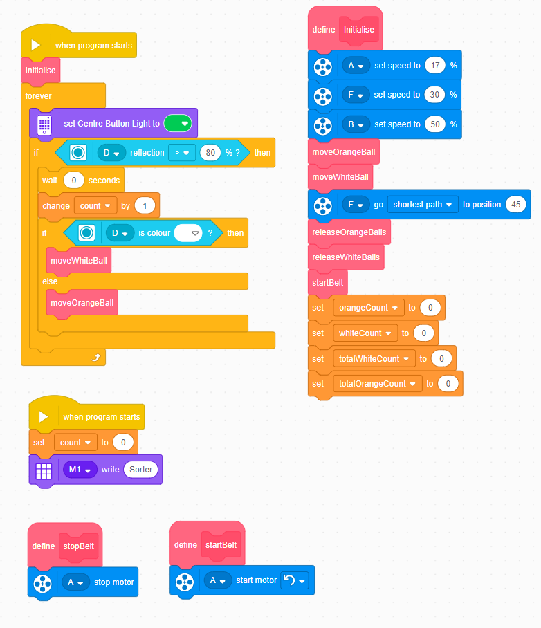The top four routines below are concerned with moving and releasing balls, while those at the bottom are triggered when an orange or white ball counter reaches 10, at which point the counter is reset and the balls released. While that's happening, the belt is paused.