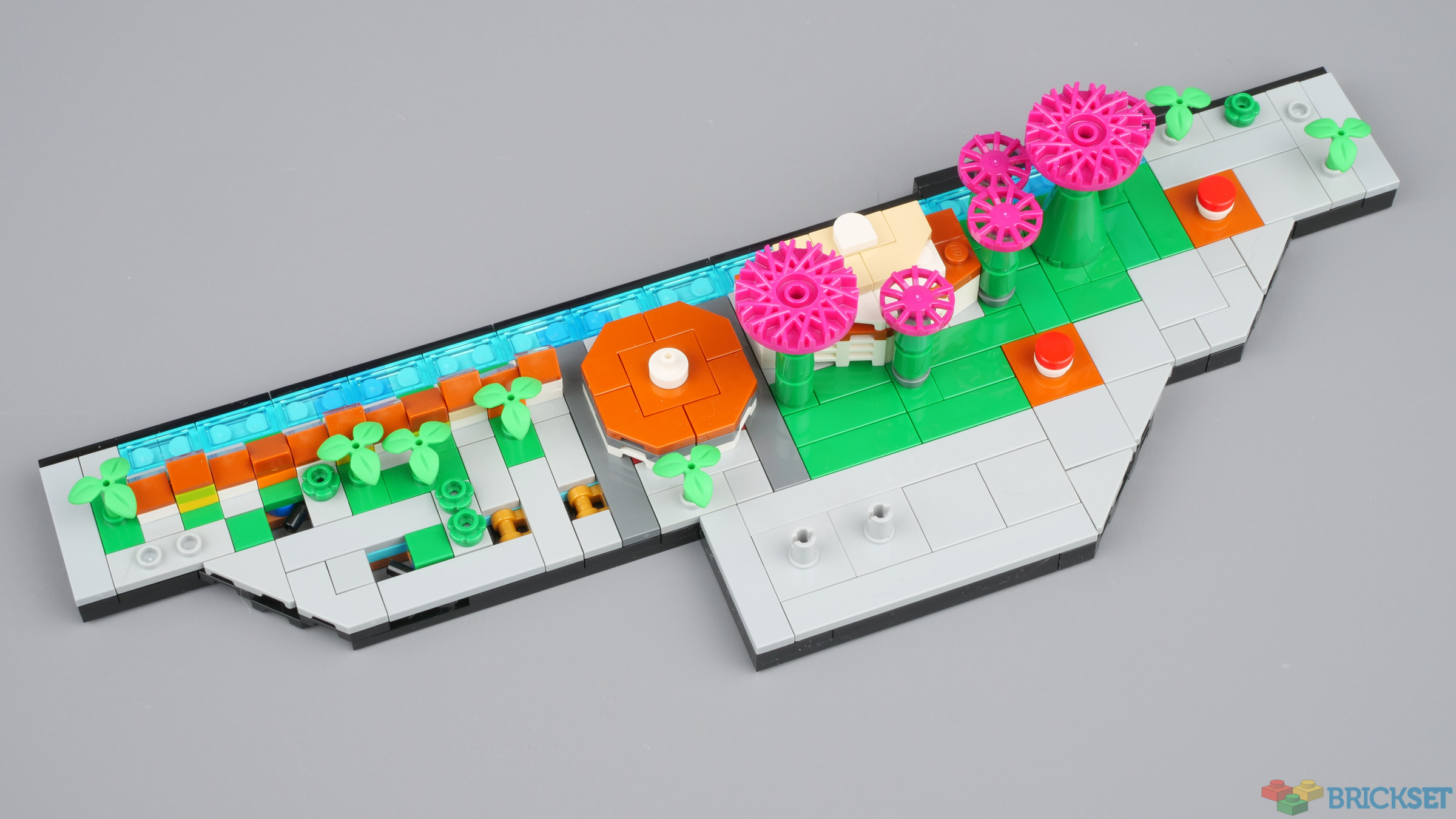I think I understand why the skyline doesn't look so convincing. It's that there is practically no sense of distance between the Marina Bay Sands and the other buildings. They're literally on opposite sides of the water. The Fullerton Hotel is much closer to the other buildings than to MBS. The Gardens would also have been behind the MBS seen from this angle, but that's not the fault of this set's designers. I also understand now why the Flyer is not shown: because it's simply not in frame.