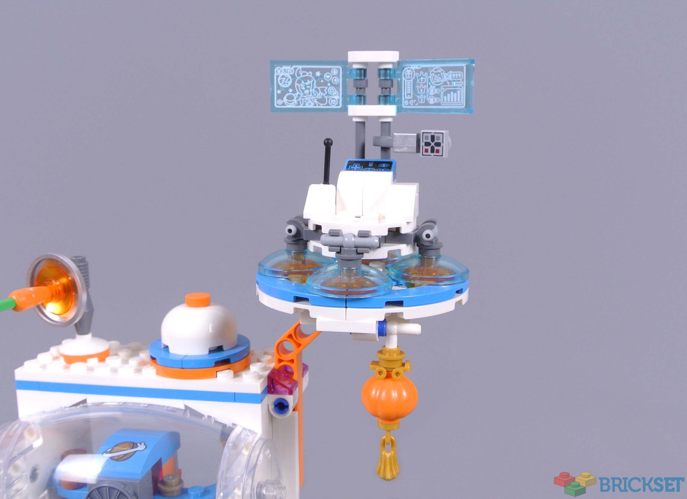 An elevated landing platform is mounted outside, supported by a single orange Technic beam. The vehicle on top belongs to Chang'e, from where the goddess presents livestreams back to Earth. The trans-light blue screens accordingly display Chang'e during a livestream and Pigsy atop a leaderboard. Trans-orange and trans-light blue dishes form thrusters, which presumably enable the craft to hover.