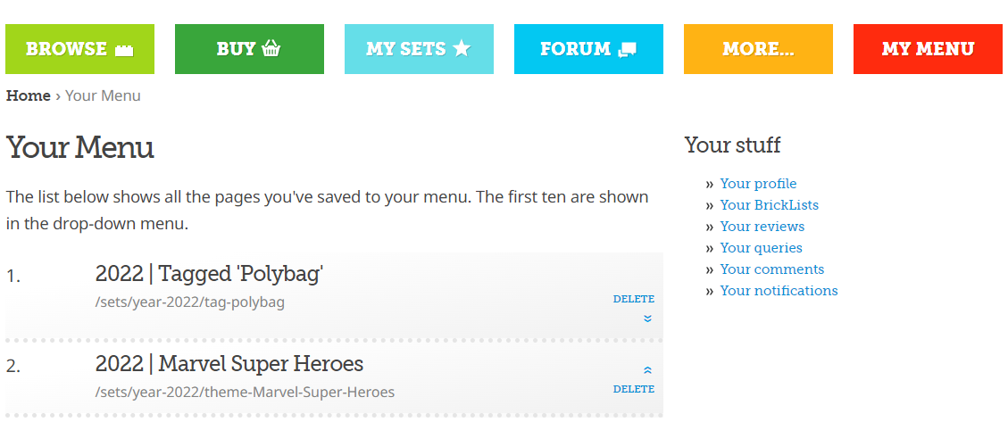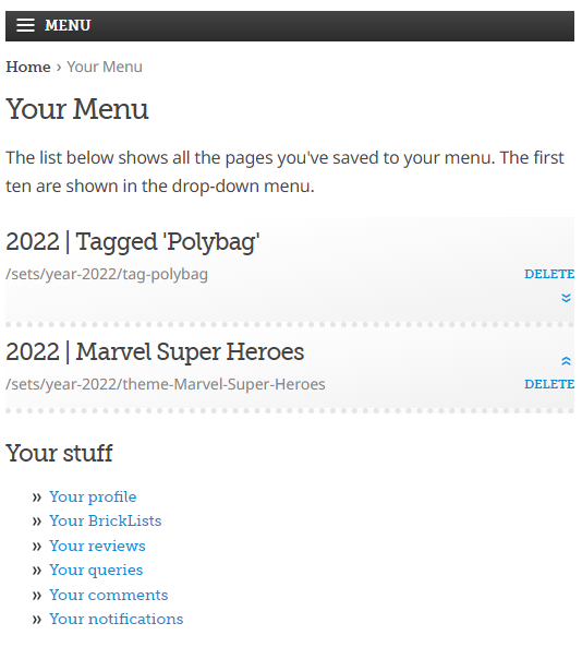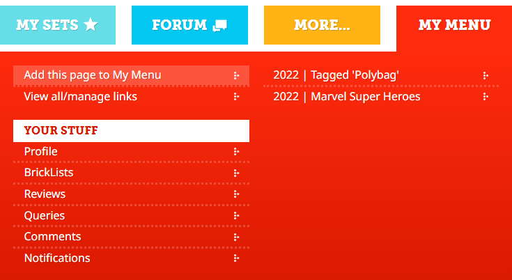 My Menu is a fantastic feature. I've been using it for years to quickly navigate to my favorite Lego themes. This is one of the many reasons Brickset stands apart from any other Lego-based website. Keep up the amazing work! @Huw