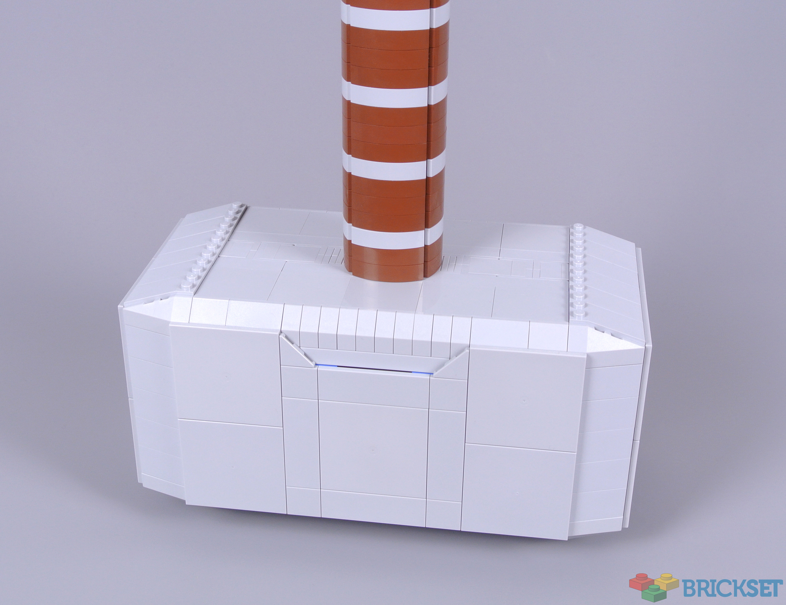 This base is also surprisingly fragile, as plates are each connected to the central 16x16 road panel using only a few studs. Nevertheless, the hammer feels entirely secure and the natural appearance of the stand is remarkable, with Mjölnir nestling neatly between bricks and slopes. Also, I am pleased the designer avoided over-engineering the base, focusing attention on the hammer instead.