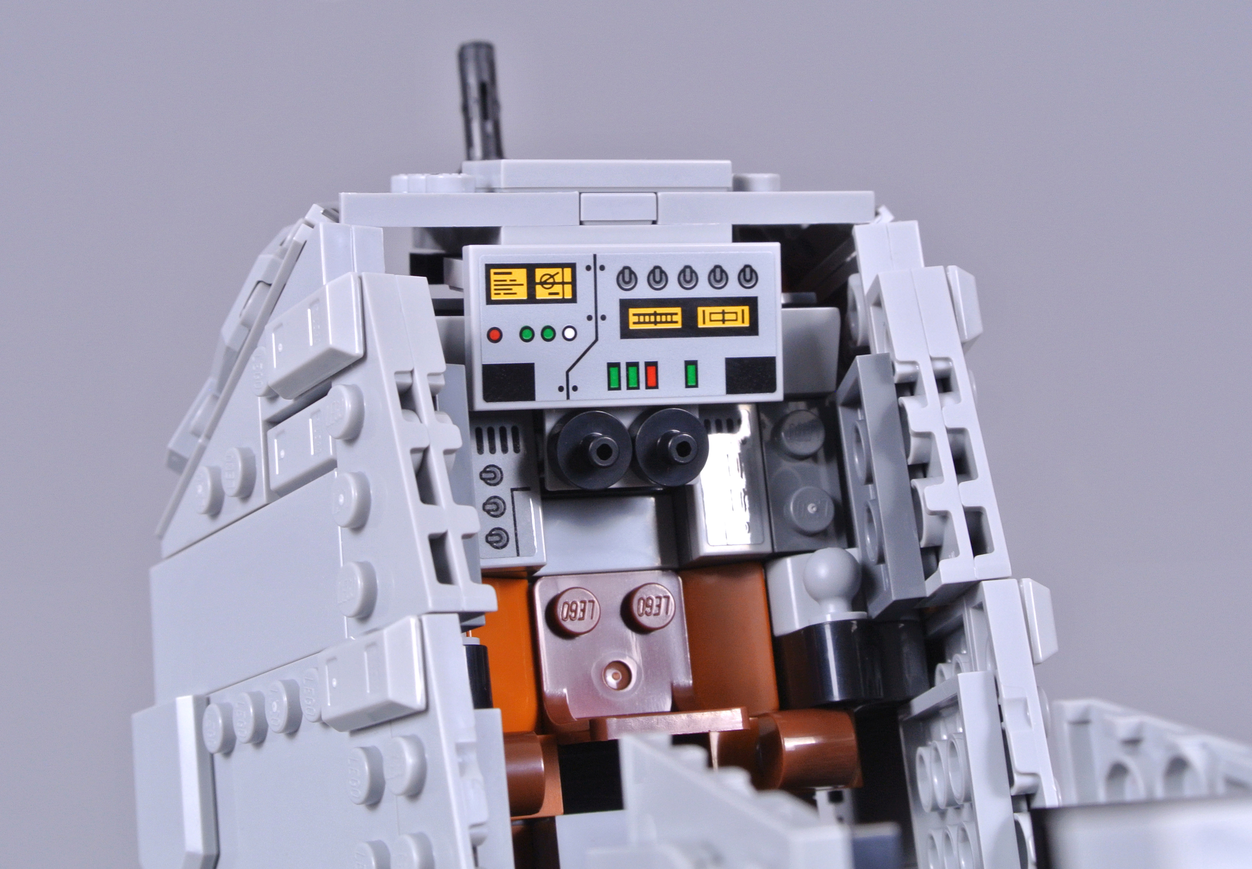 Opening the canopy reveals space for the pilot inside, surrounded by stickered consoles and two control levers. Some Technic pieces remain visible, but these are disguised relatively well and I like the reddish brown seat. Furthermore, access is very easy because the whole canopy is connected using clips.