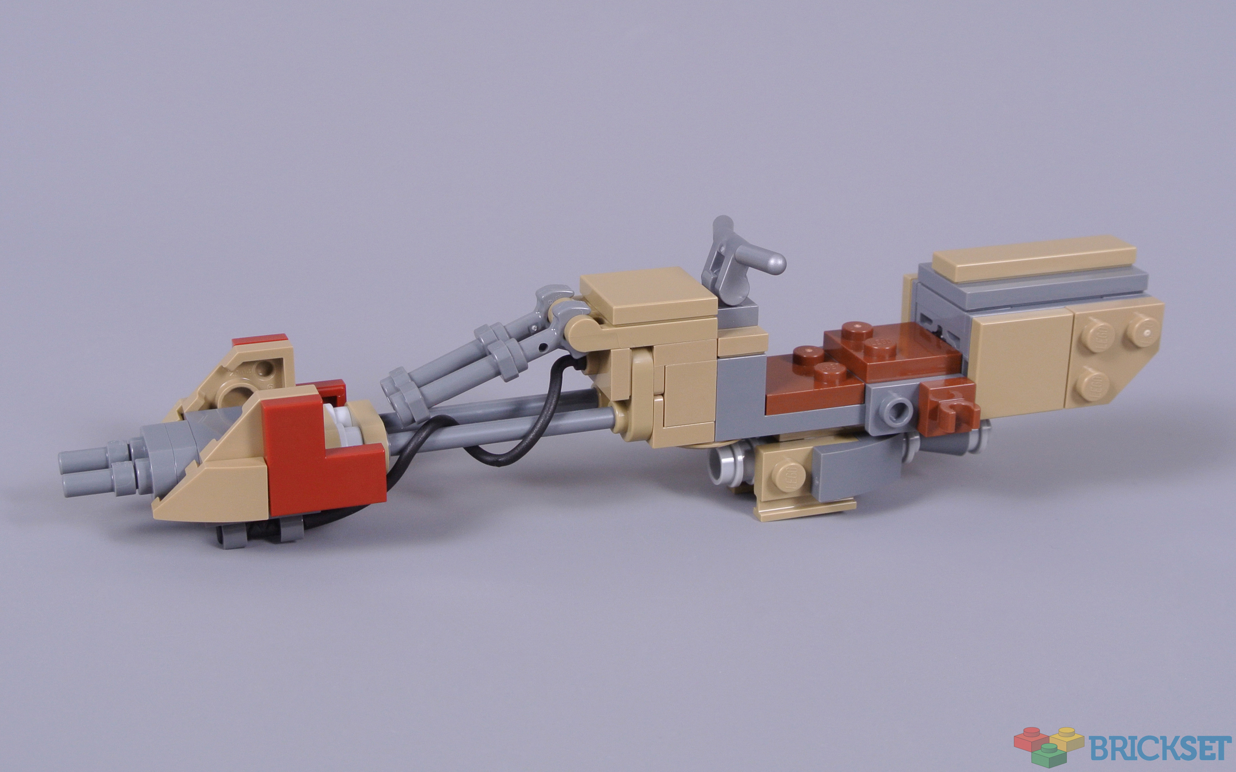 Dark red highlights on the steering vanes are the only colourful feature of an otherwise muted vehicle. Furthermore, the proportions between the steering vanes, the outriggers and the main body of the bike are nicely balanced, reminiscent of the Lars' swoop bike in 7113 Tusken Raider Encounter. Despite appearing fragile, the model definitely feels sturdy enough for play.