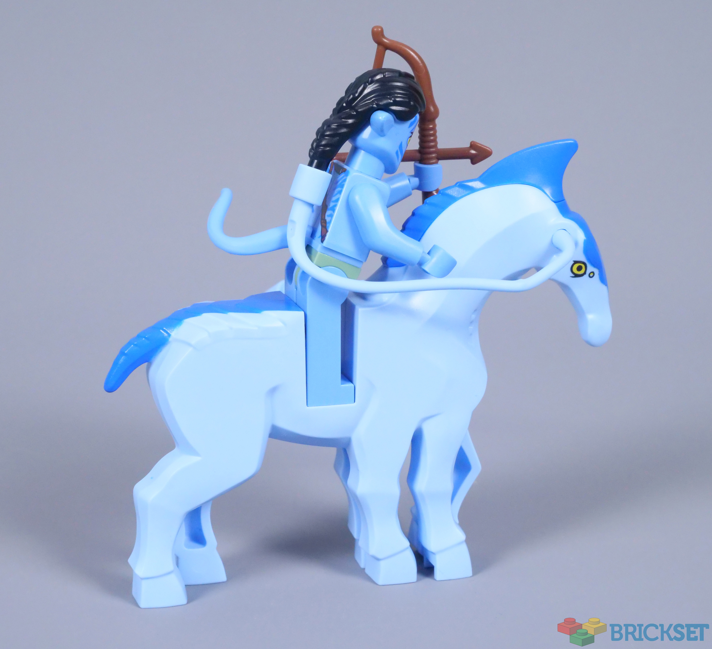 Unfortunately, neither the head nor any of the legs are articulated. Choosing to omit articulated joints has improved the accuracy and detail of this figure, but some motion would have improved its display potential. Nevertheless, you can remove the 1x1 bricks with clips from its body, which creates space to place a minifigure in the gap. Additionally, the flexible queues can connect to a Na'vi minifigure's hair, recreating their bond from the film.