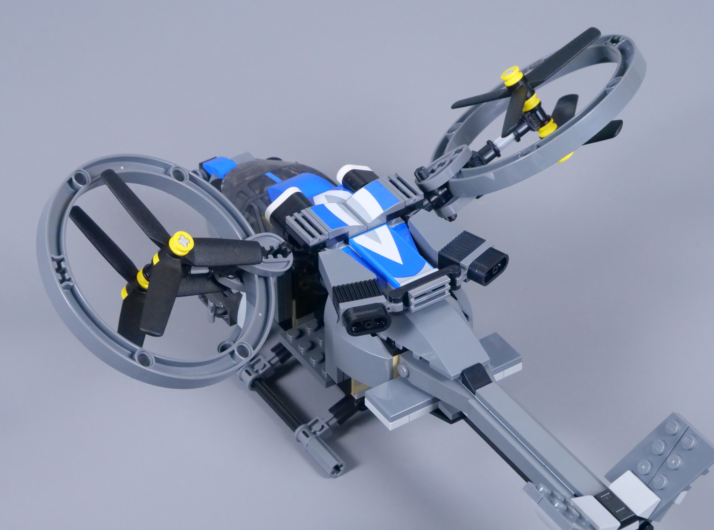 The twin rotors invite comparison with 8117 Storm Lasher, although these circular structures are constructed around the 11x11 circle beams released last year, rather than brick-built rings. Their proportions reflect the onscreen vessels and I like the continued blue and white pattern between them, comprising four more stickers. The tail boom also appears accurate, while I think even the yellow Technic bushes on the rotors are excusable.