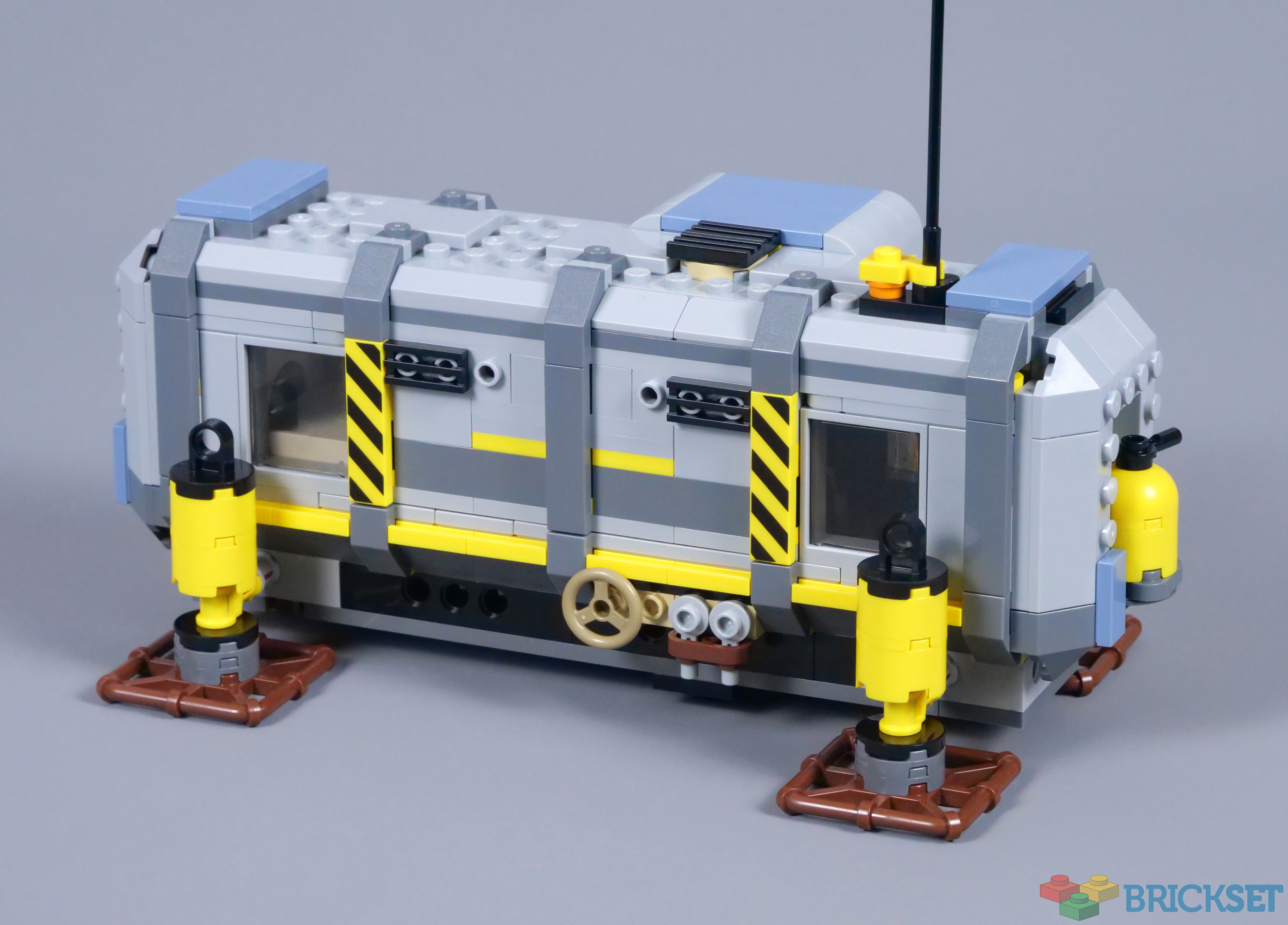 Surprising detail decorates the back, including control systems for the interior with some printed hazard stripes. Black grille tiles are also used to good effect, while a yellow tank is placed at one end of the station, presumably providing oxygen for its occupants. The antenna on top provides another realistic detail, although the single orange 1x1 round plate looks odd.