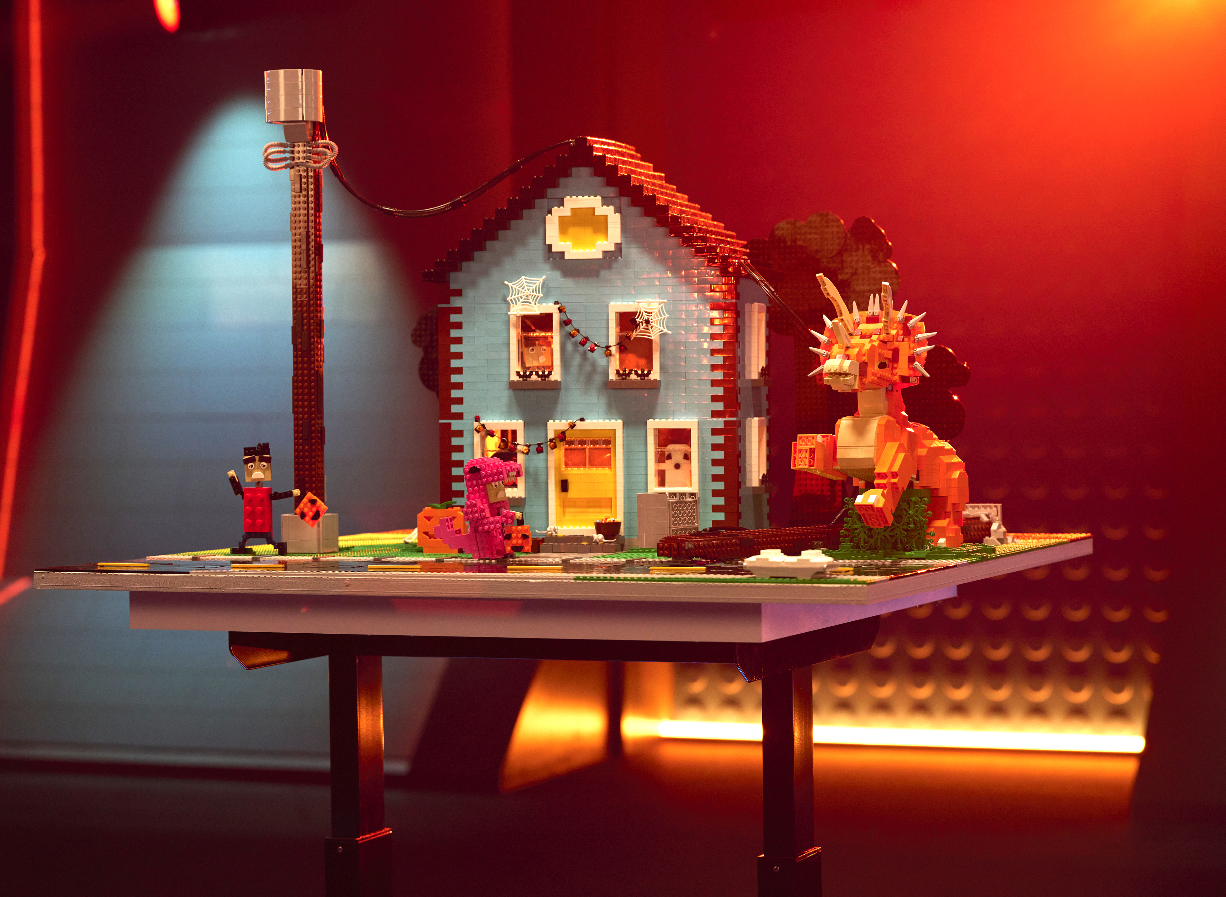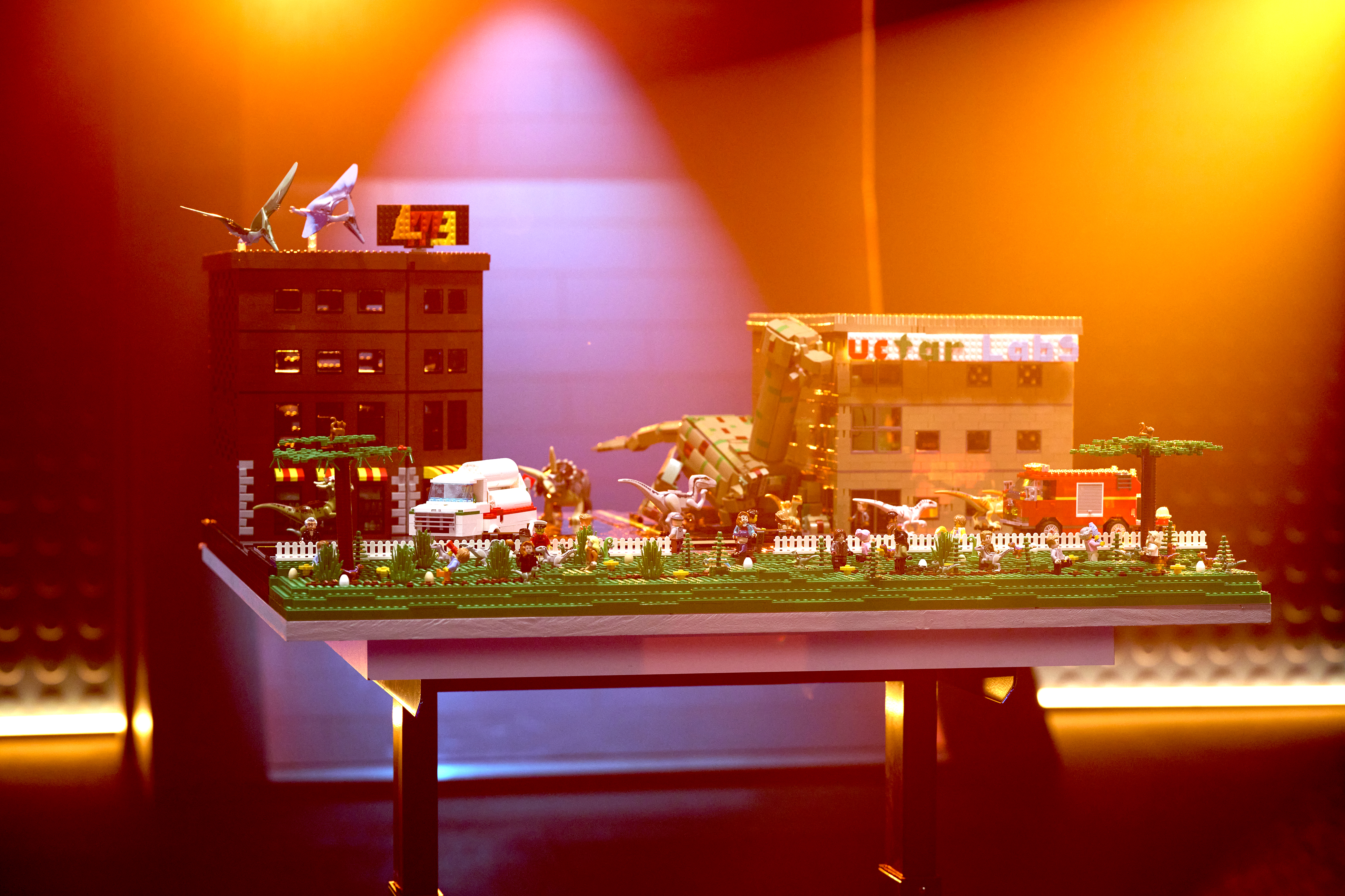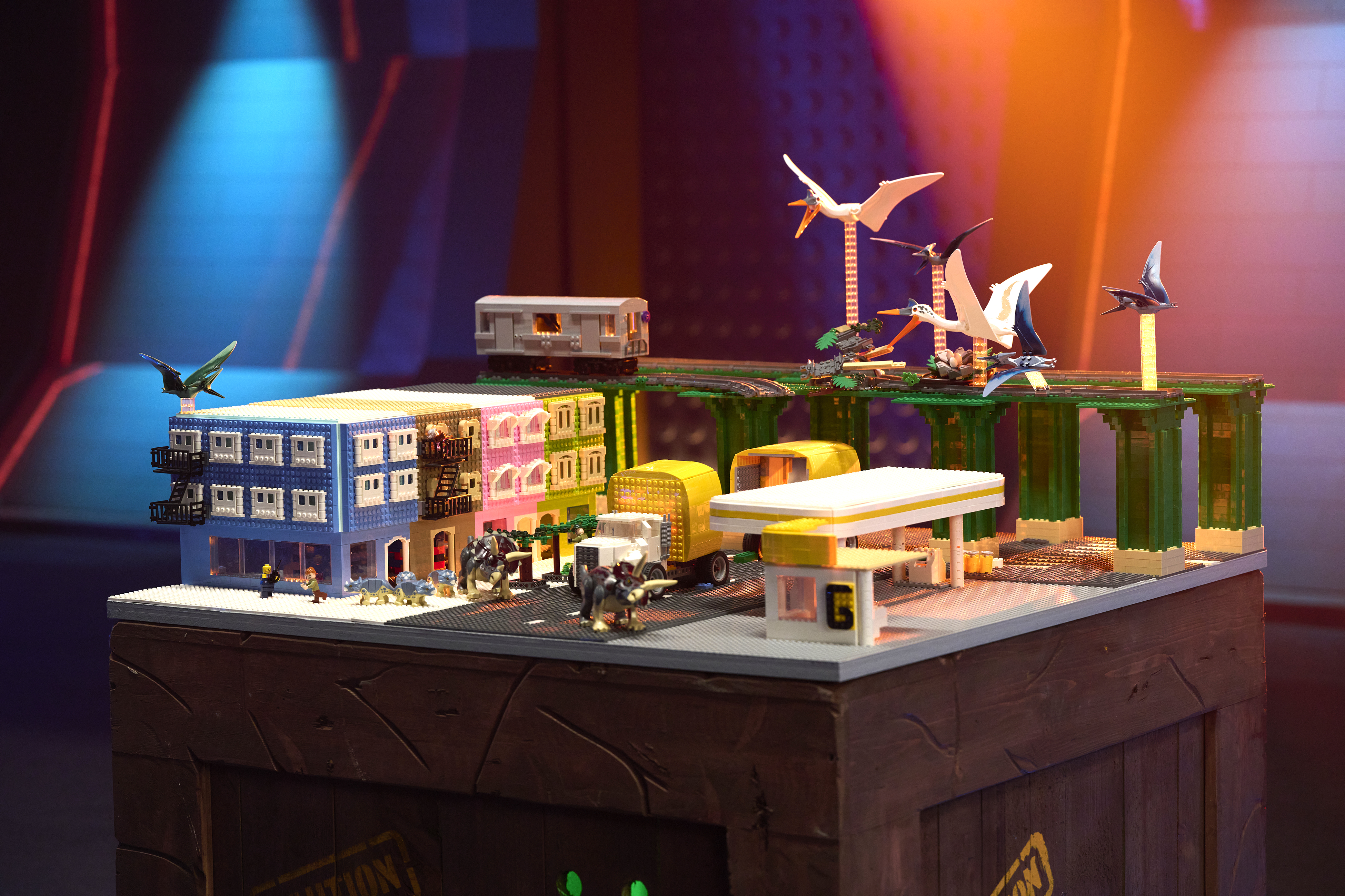 Eddie: Believe it or not. That was one of my favourite parts too. Yeah, it's so fun. I can't tell you how much time we spent in parks growing up. That was our jam. We go to the park, we get some ice cream hanging out at the park all day. So that iconic park bathroom, as funny as that may sound, that's something that really stands out. It was pretty epic the way that she threw that thing together. It was effortlessly done. I loved it. For me the other part of the build that I enjoyed but also tortured me was that dinosaur. That dinosaur we knew we wanted to go with minifigures in the story. We couldn't build a huge dinosaur. The contrast wouldn't work. But the motion that I had had in mind for it, and this wasn't shown on the show, we wanted it to look like as the dinosaur was coming over the movie screen and he got caught in the wires. I didn't want the motion because the motors will make the dinosaur move completely side to side, which is not what we wanted. There was too much torque inside that motor. I'm new to using motor function. So as we're learning how to slow down the movement, that took up a lot of time. That’s where we got in trouble that we had so much open space so late into the build, because the majority of that time I was actually trying to figure out that power function and how to make the dinosaur not fall apart once we turned it on. The dinosaur was sitting in two parts and it was only connected by a half inch point. So had we turned that motor on and went full function, the top of the dinosaur would have literally flown right off. I did want it to have a real jerky caught up funny looking motion, which I feel like we succeeded in but I don't think they showed that. That was pretty exciting for me because I had never attempted that before. I feel like I executed it. It worked.