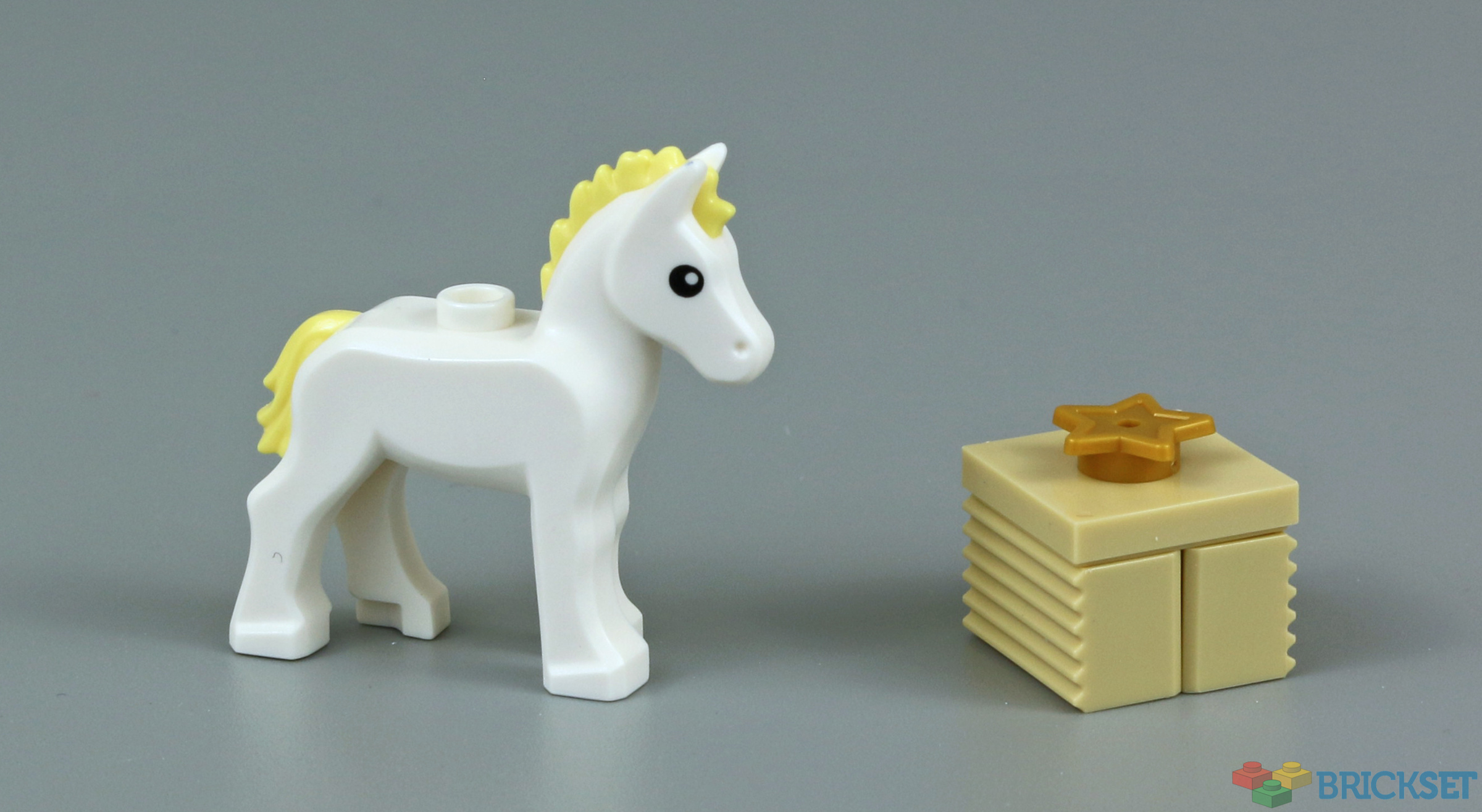 A pony! What a cute little pony! It's white (one could argue winter-themed from the colour) with a cool yellow mane and tail. It also comes with a supply of hay, though I'm not sure why there's a star on top. I'm not sure that I would consider basic sustenance to be a gift.