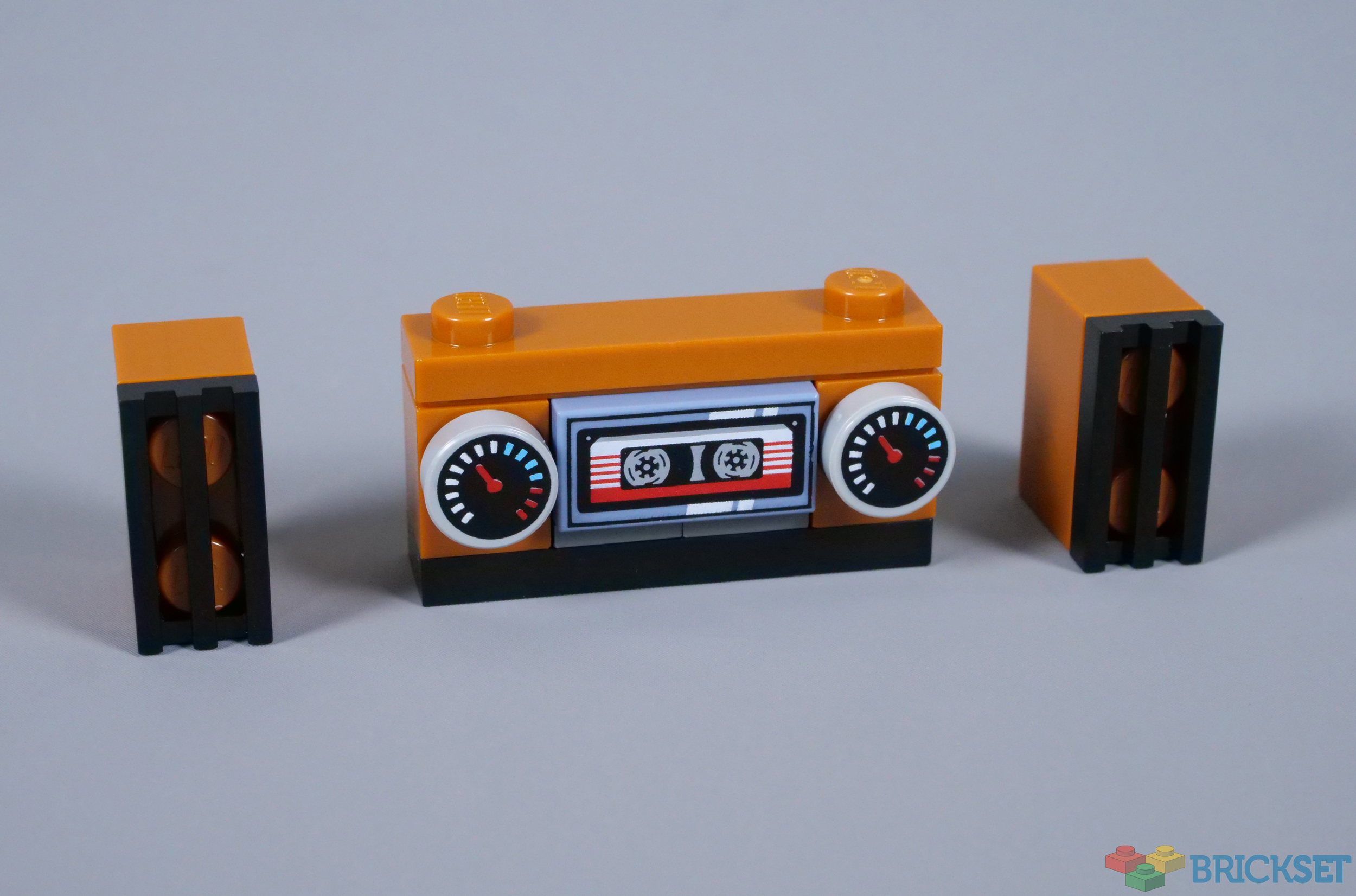 At first I thought it was a boombox with two additional speakers, which wouldn't make sense, but I guess the printed plates on each side of the tape deck are supposed to be knobs for controlling volume and bass/treble. Not perfect, but at least the brown pieces make it look like a machine from the 70s.