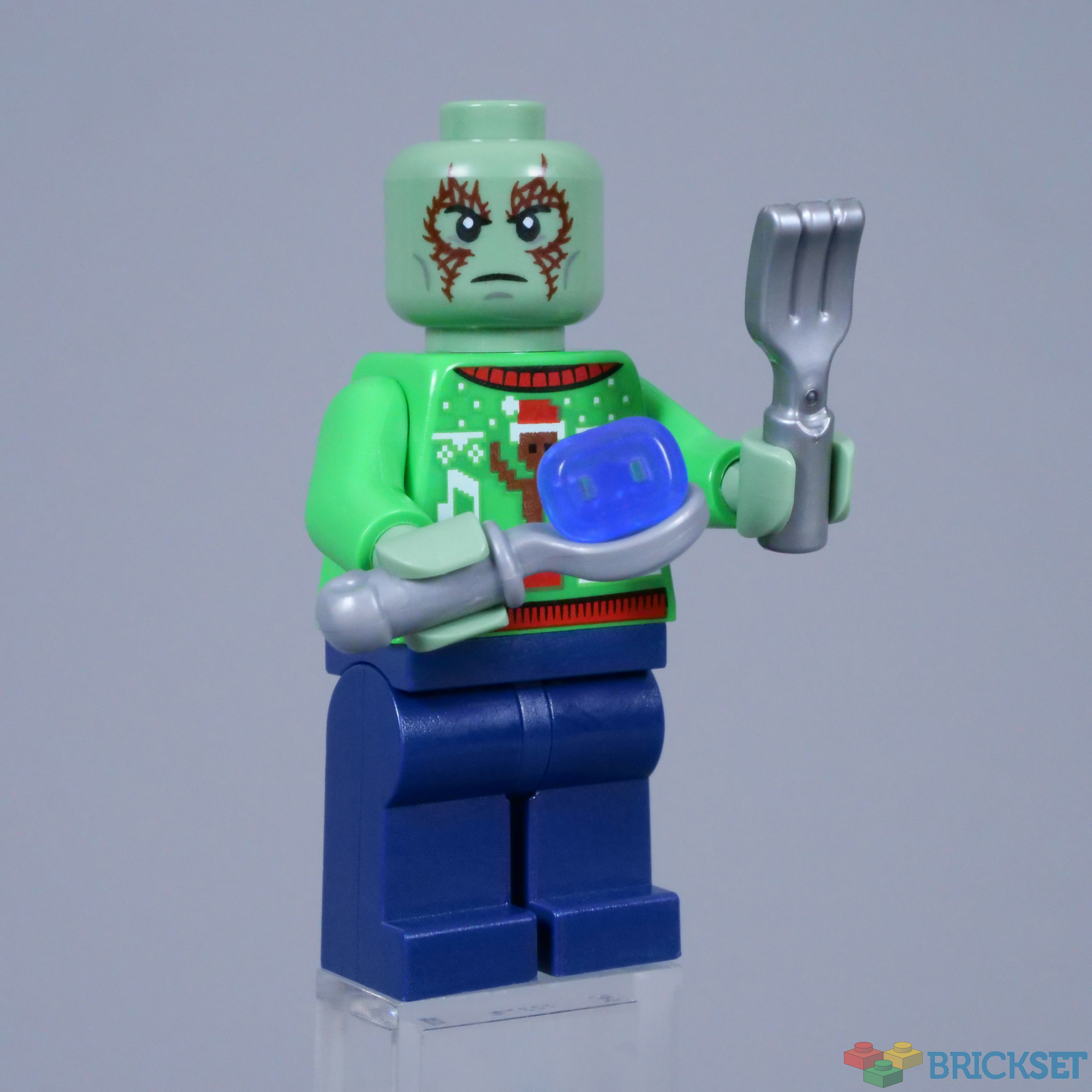 Unfortunately, this design does not actually match Drax's attire from the Guardians of the Galaxy Holiday Special, which features a cat with lasers shooting from its eyes. The bright green colour is accurate though, probably coincidentally, while Drax's skin tone has also been updated for his latest appearance.