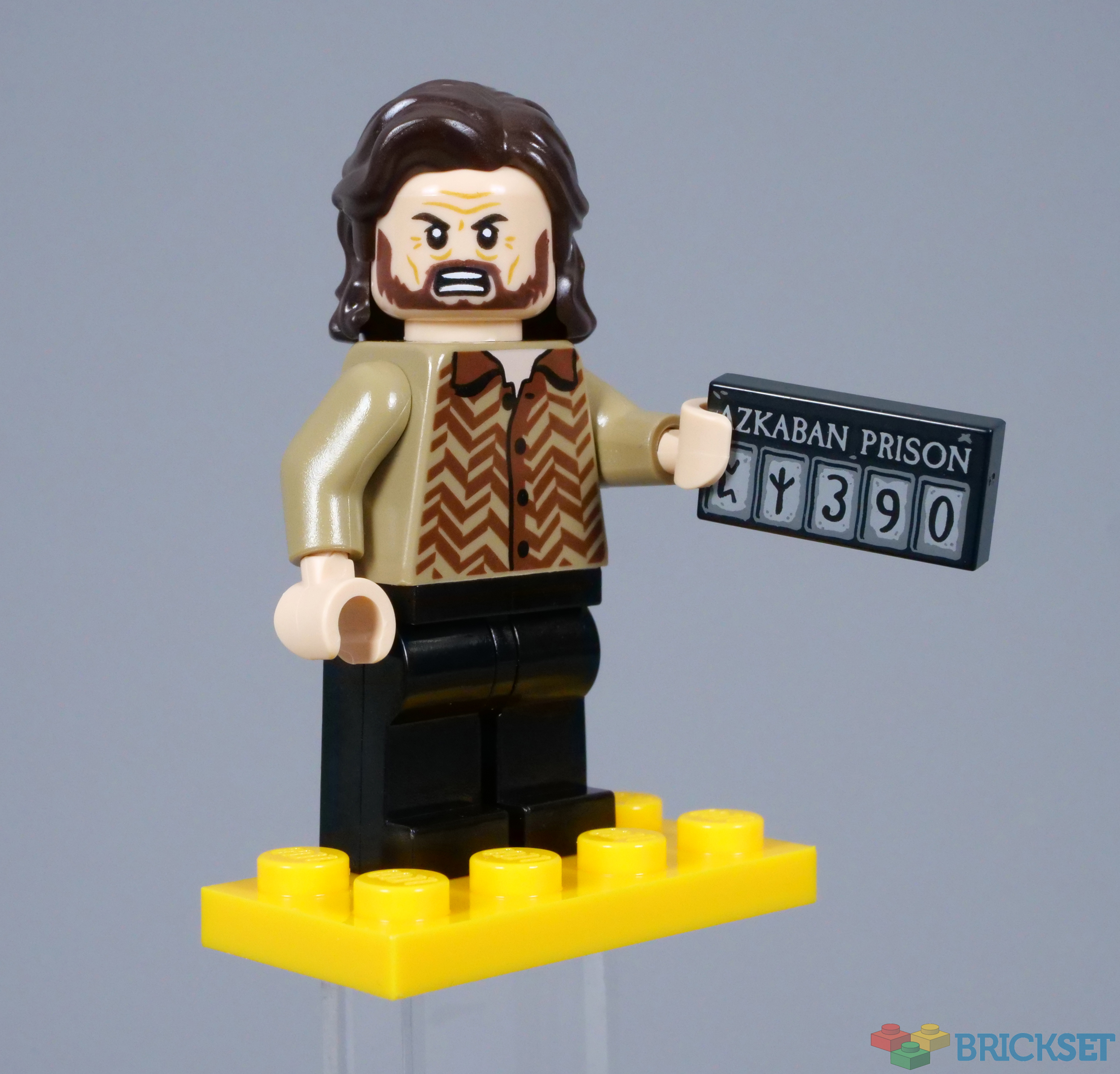 Sirius carries a 1x2 tile, decorated with his prisoner number. This design is simplified in relation to the onscreen prop, but corresponds with Bellatrix Lestrange's accessory in the second series of Harry Potter Collectable Minifigures. Also, the minifigure stands on a flame yellowish orange 2x4 plate, continued from previous The Prisoner of Azkaban items in the calendar.