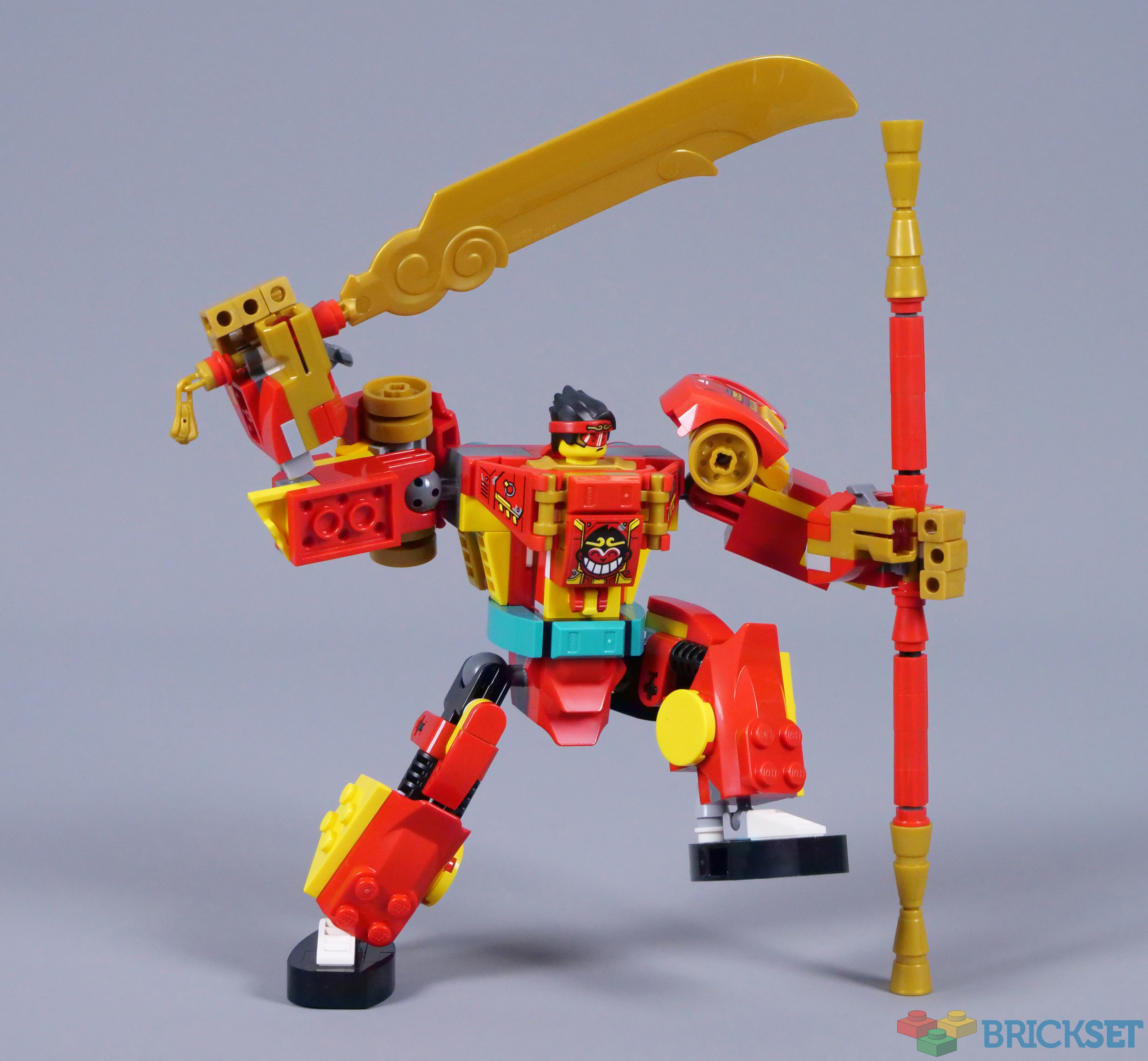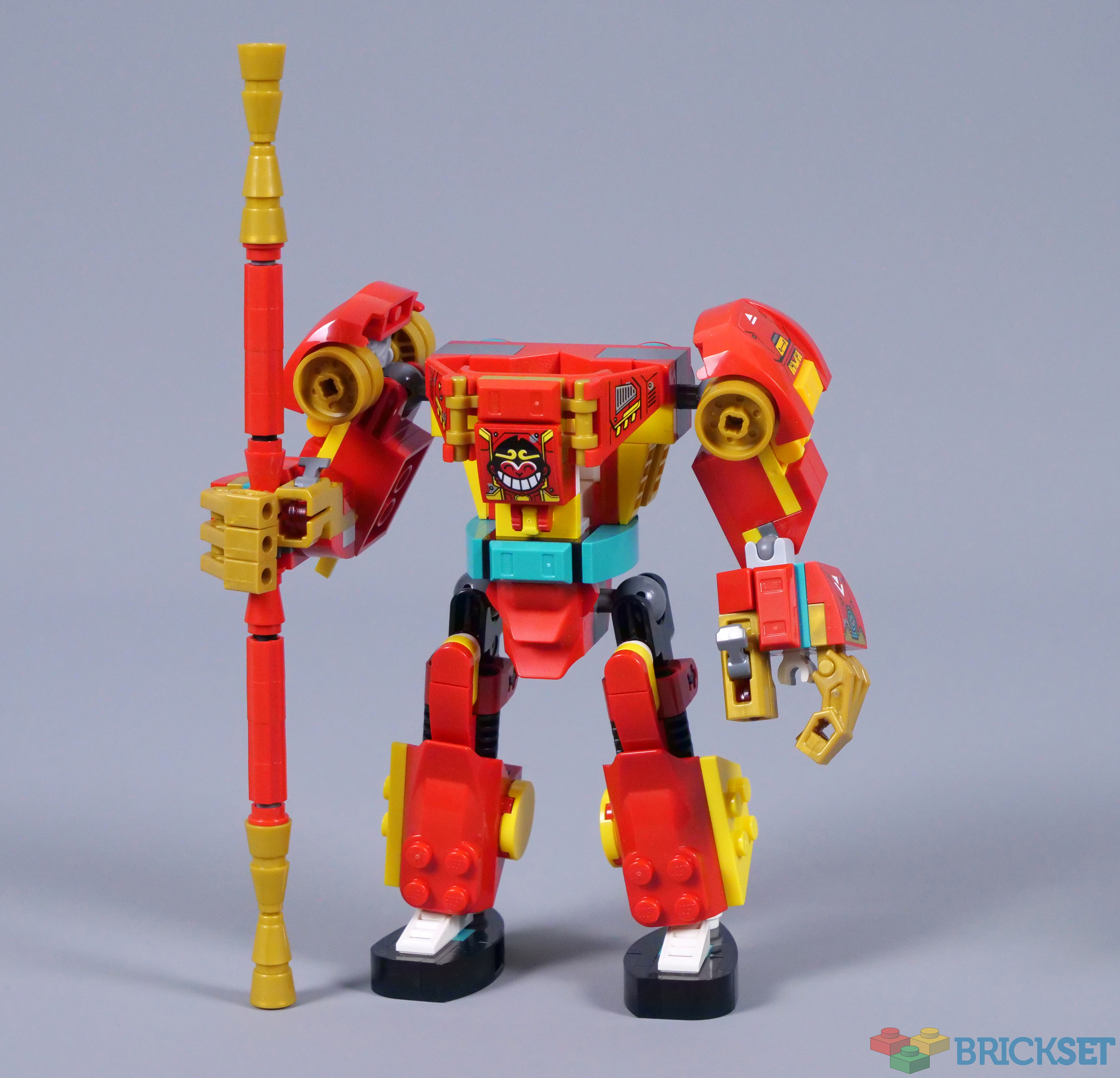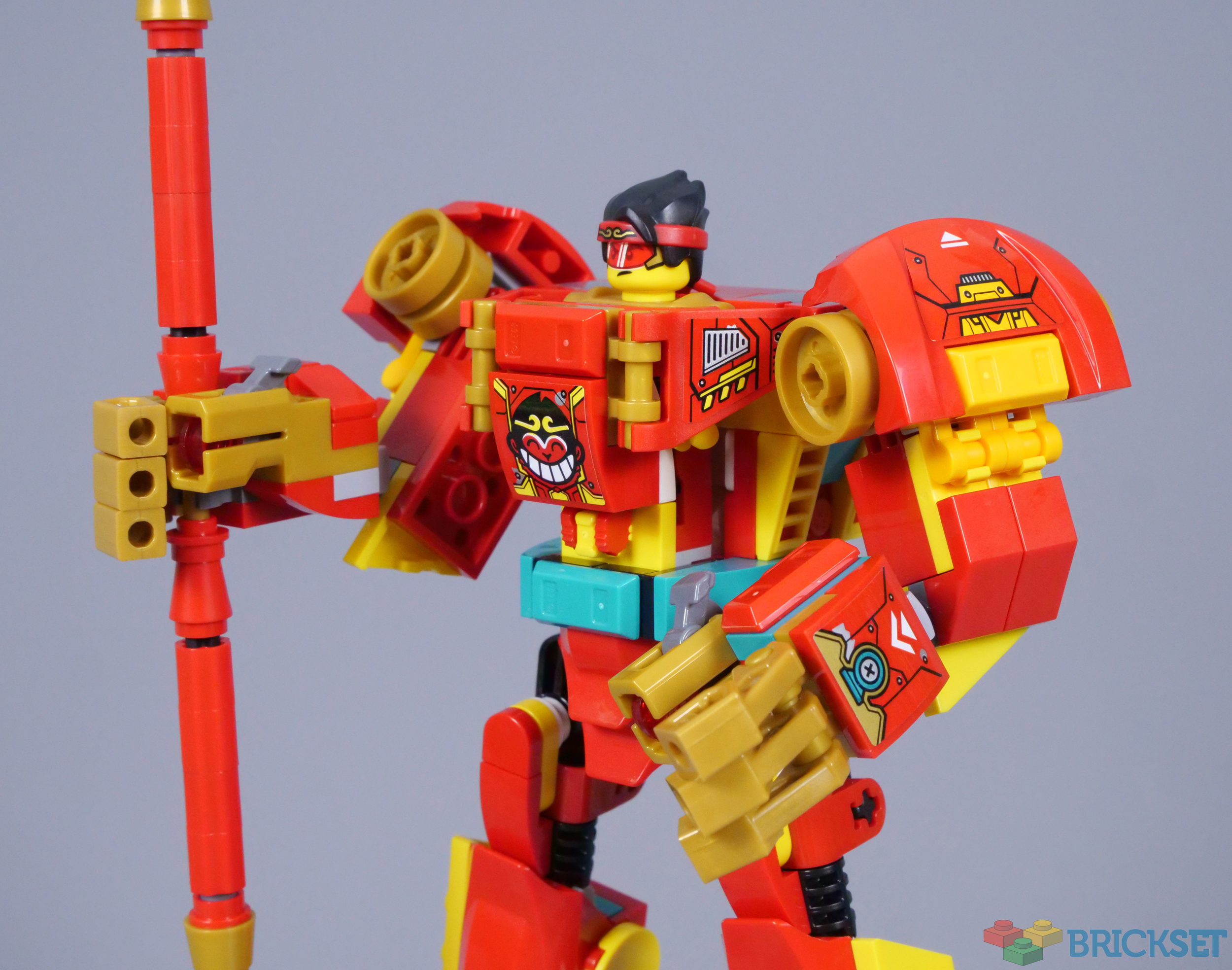 Monkie Kid has already piloted several mechs in the three years since this theme was launched and the latest example is familiar. The red, flame yellowish orange and teal colours are shared with previous models while the height of nearly 14cm is close to Monkie Kid's mech from 80028 The Bone Demon. However, this design is much more elaborate and altogether better.
