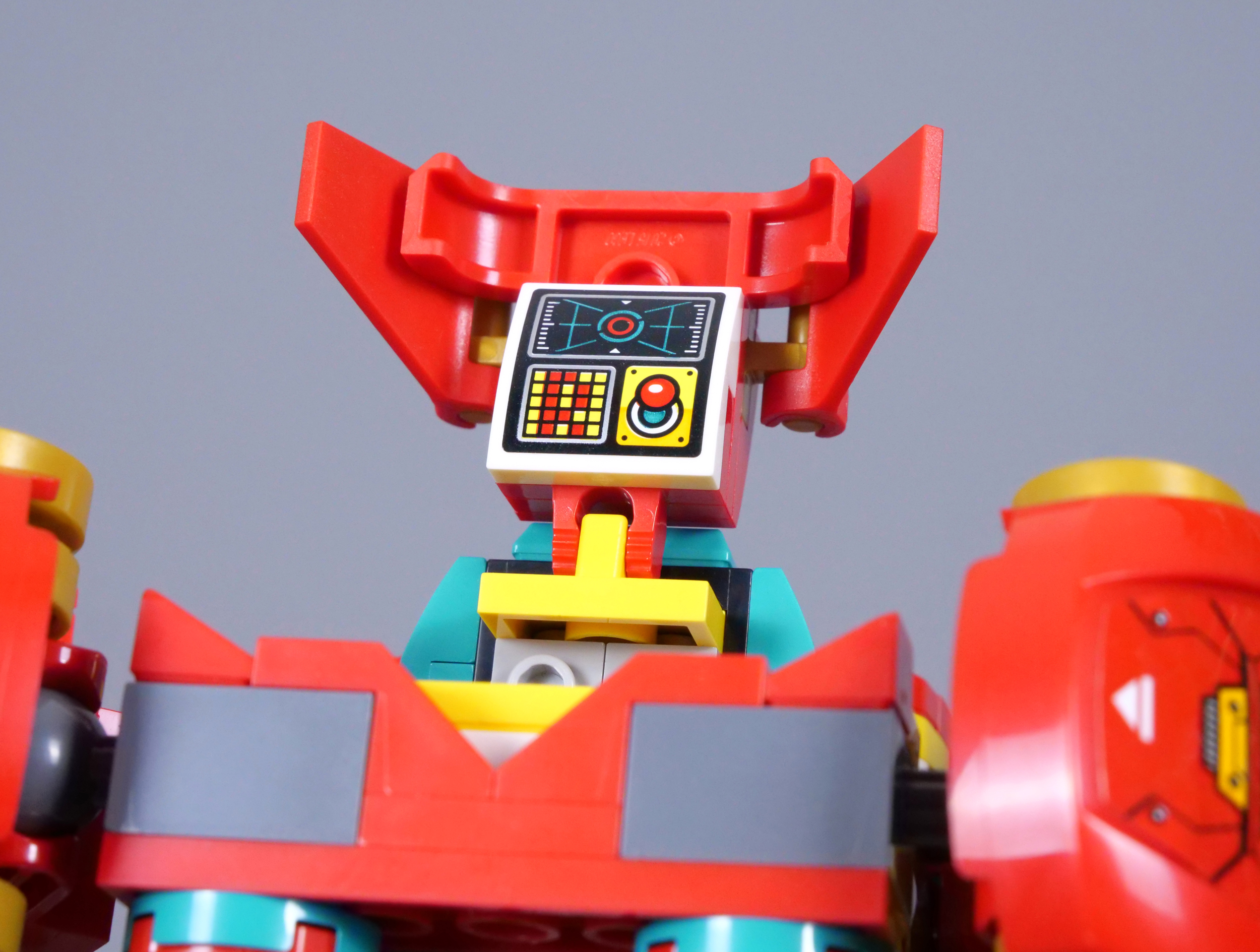 The chest armour is attached using a click hinge, so can be opened to access the minifigure, as shown below. I like the controls and targeting display inside, especially since their bright colours reflect the mech's exterior, although this sticker is actually oriented incorrectly in the instruction manual.