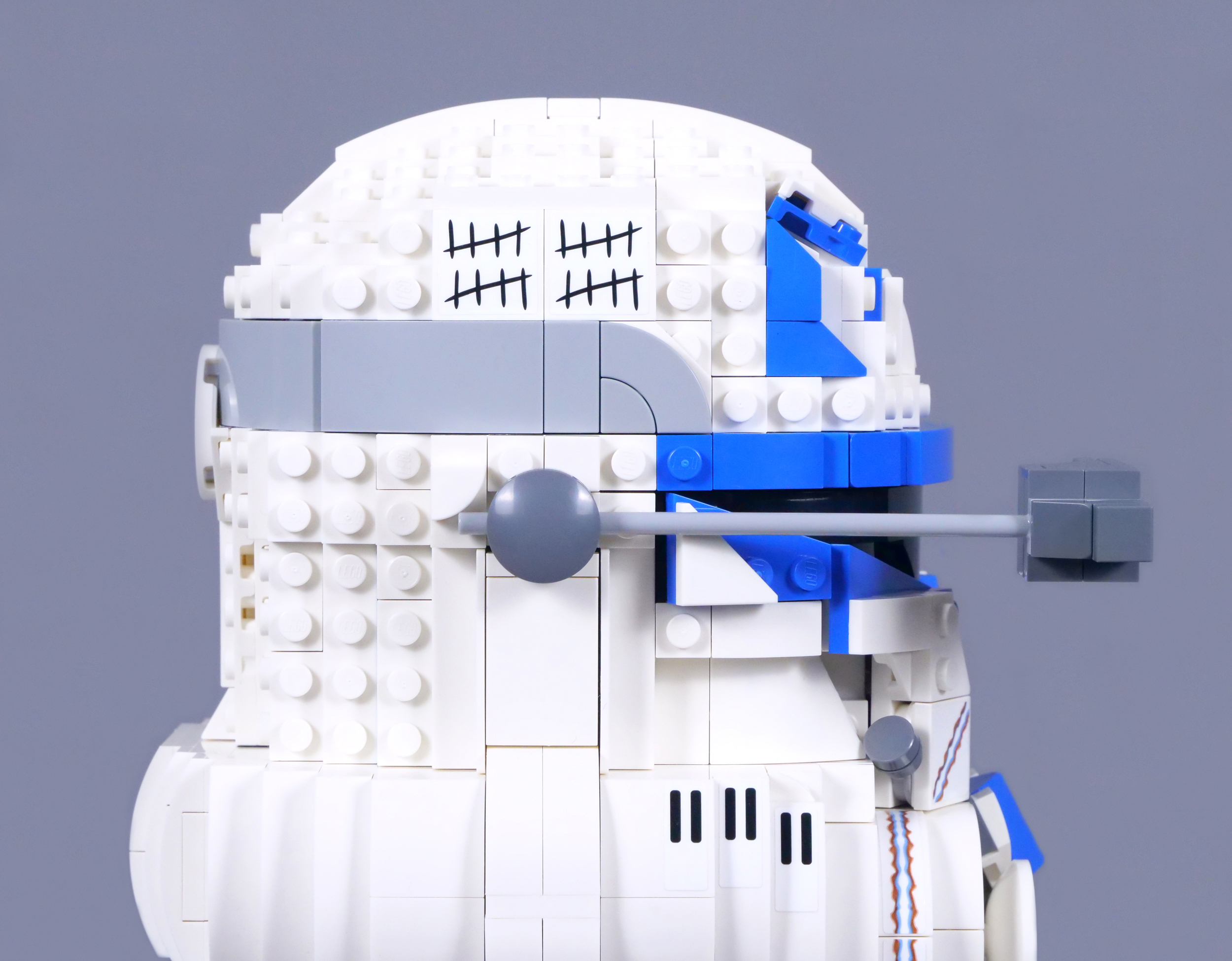 Additionally, I love the dark bluish grey filtration nozzles on Rex's cheeks, while the blue border around his visor looks good too. Perhaps most remarkable though, are the brick-built Jaig Eyes above the visor. These honours, of Mandalorian origin, are awarded to Clone Troopers for noted heroism on the battlefield and their integration with the curvature of the helmet is impressive.