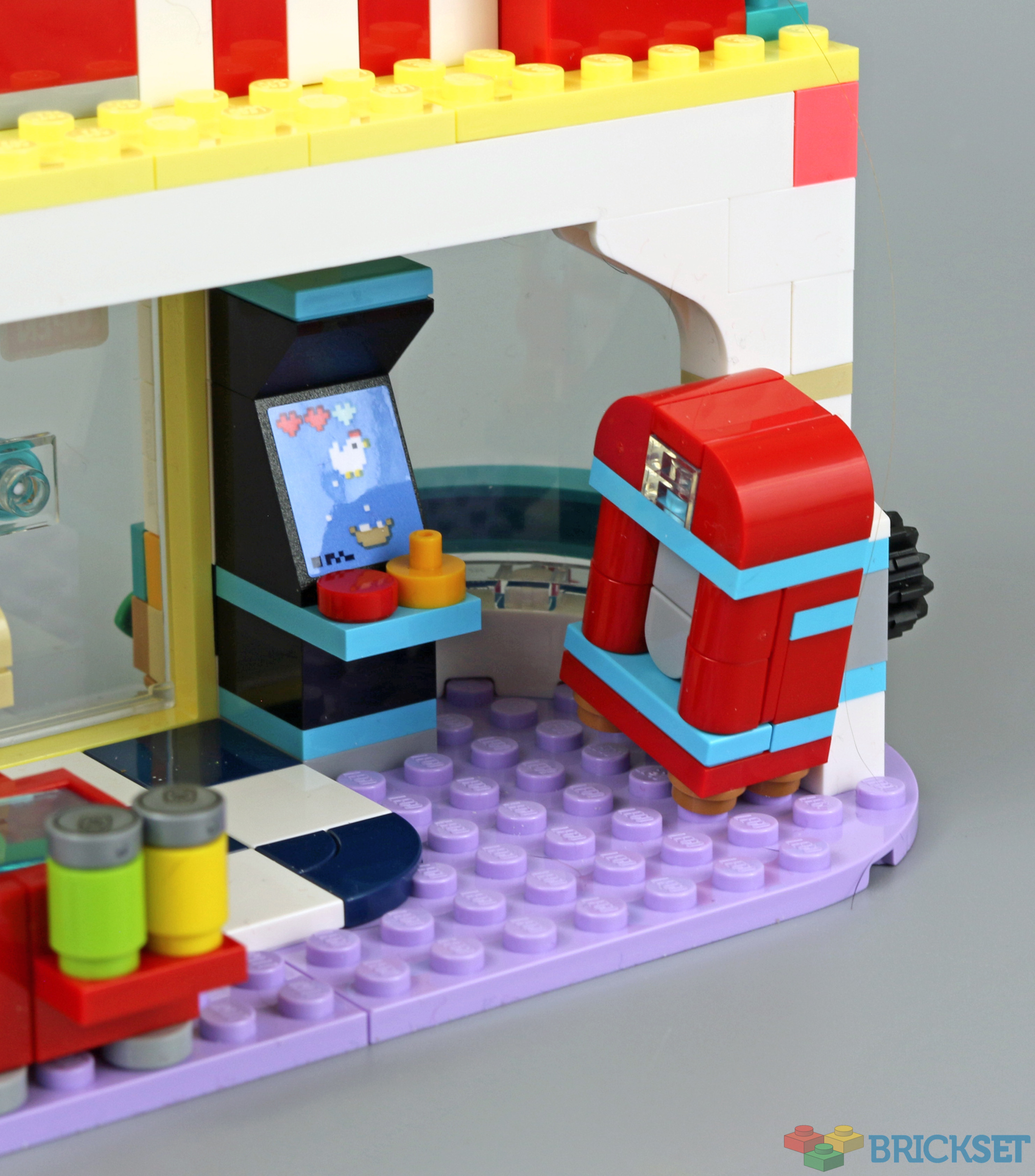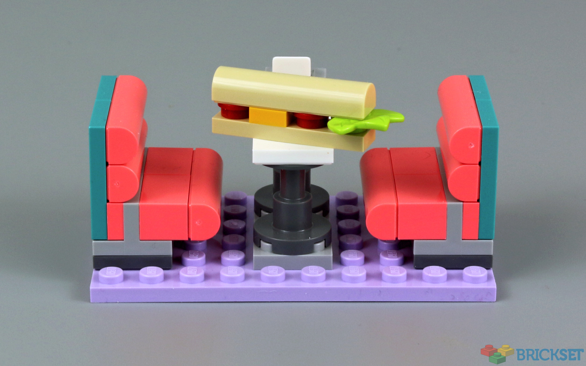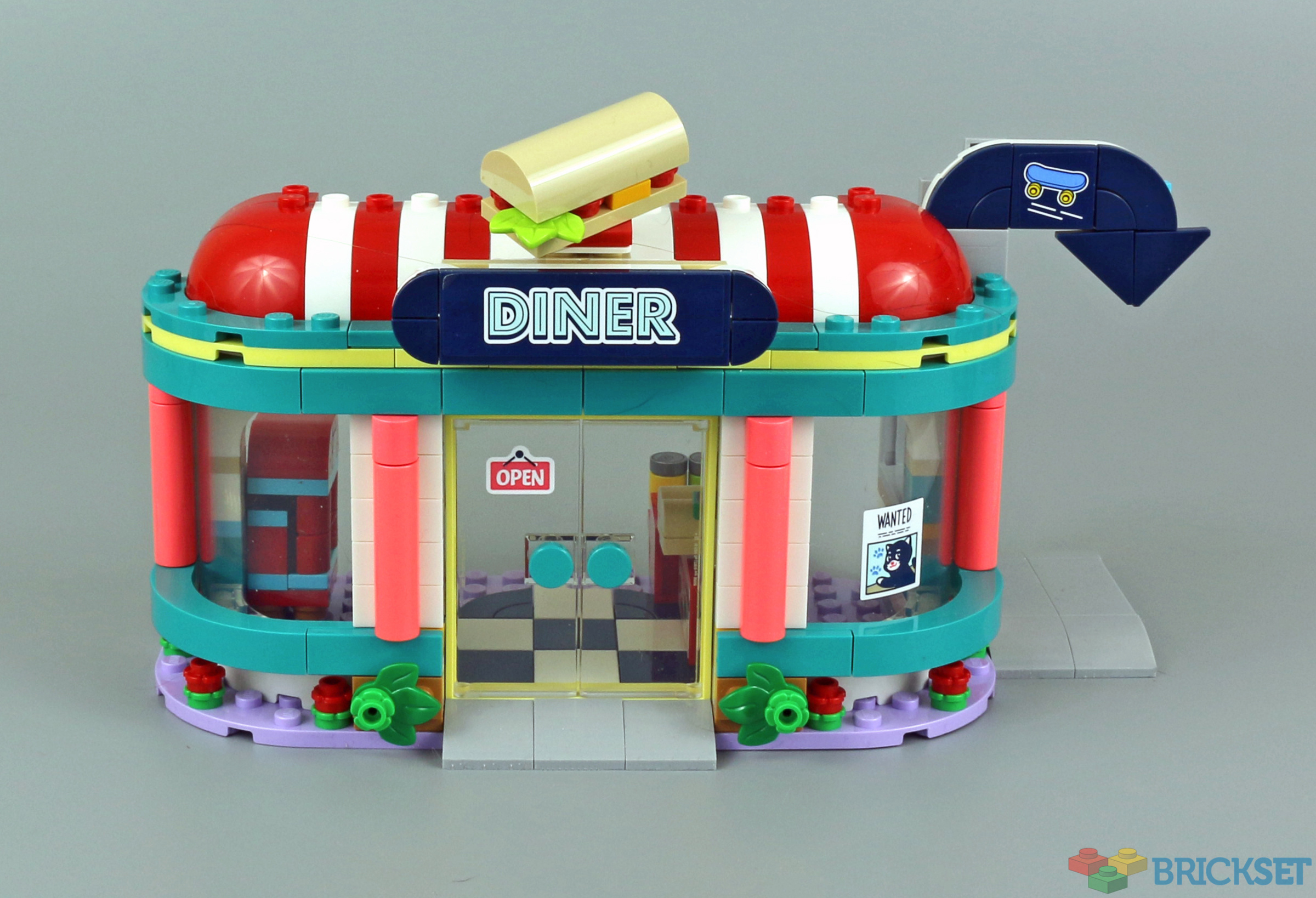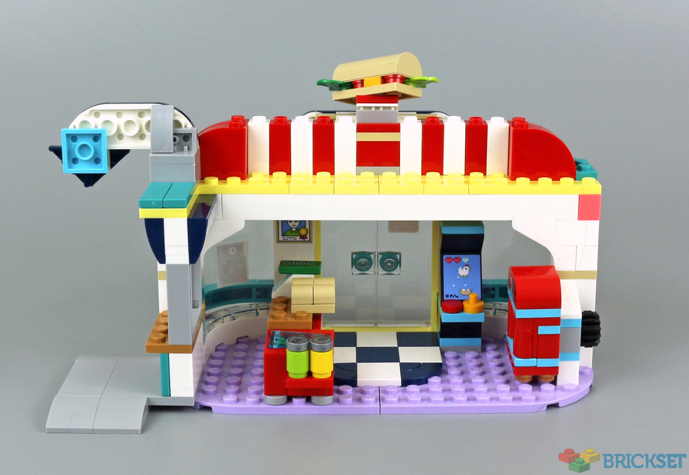 The facade for the building is excellent - love the red and white roof, and the large brick built sandwich. The rocking jukebox is a really nice touch. In comparing it with 41349 Drifting Diner, the building is certainly more substantial in this set, but there are more activities and opportunities for play in 41349 (as that had a race car and a drive in cinema).