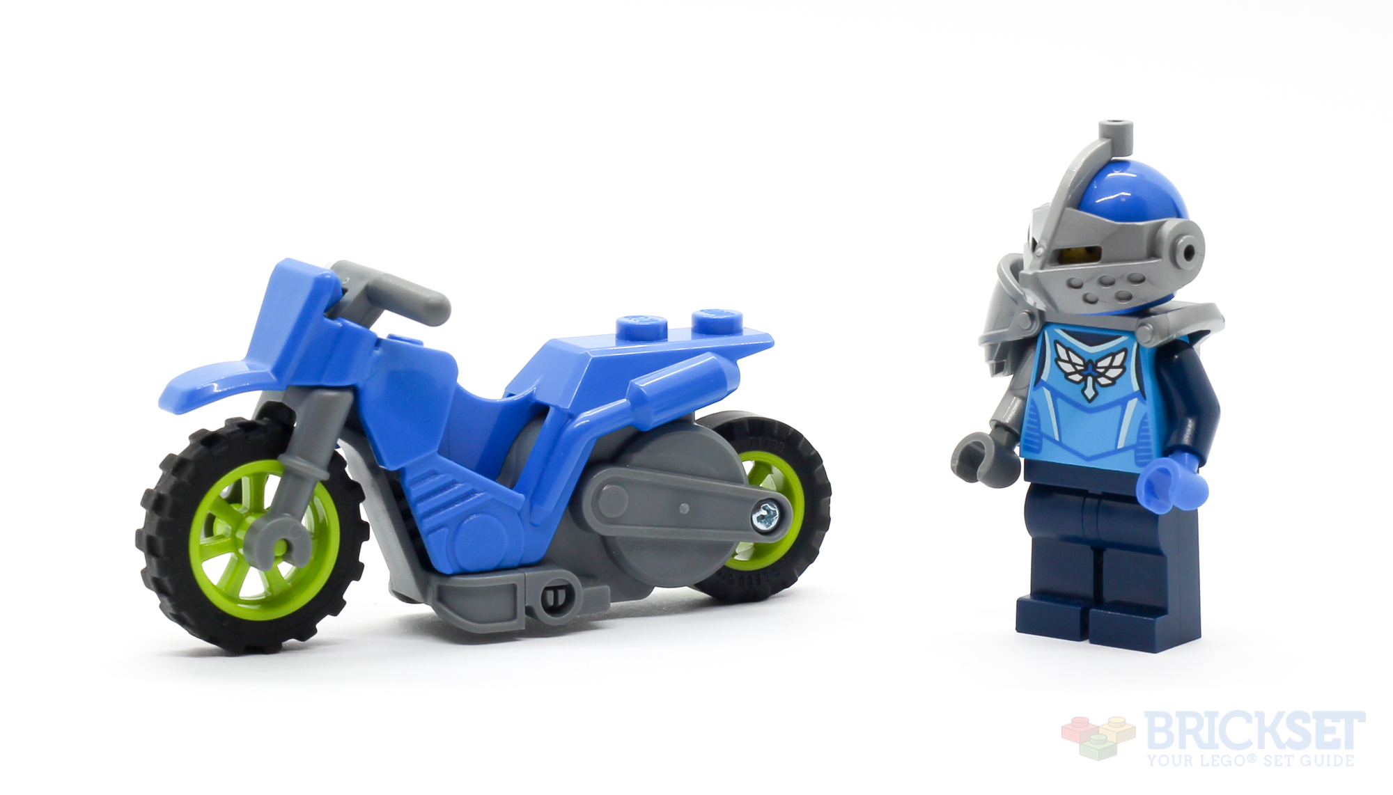 Each rider's bike matches their respective colour schemes; the knight's cycle is blue with green wheel rims…